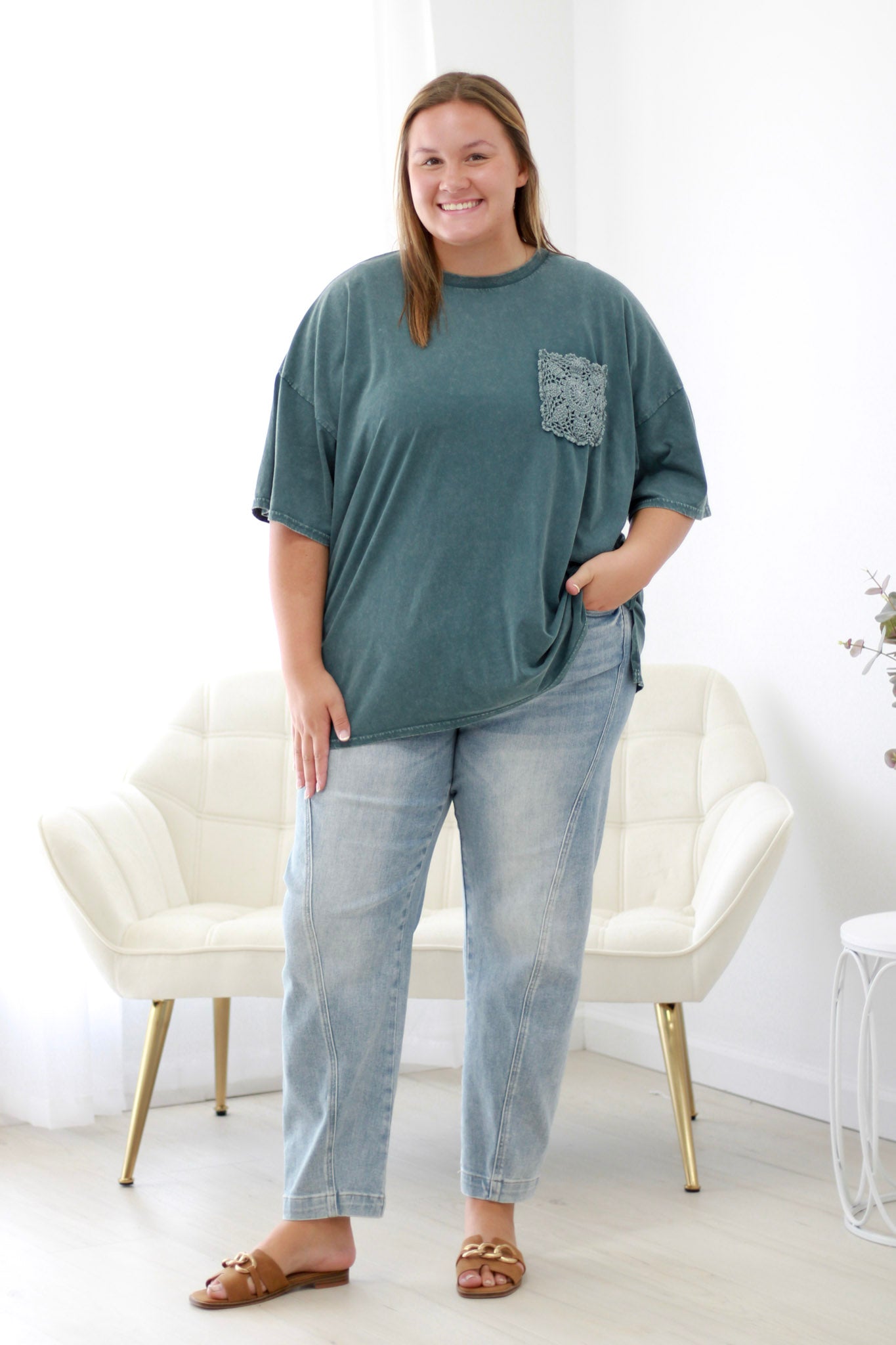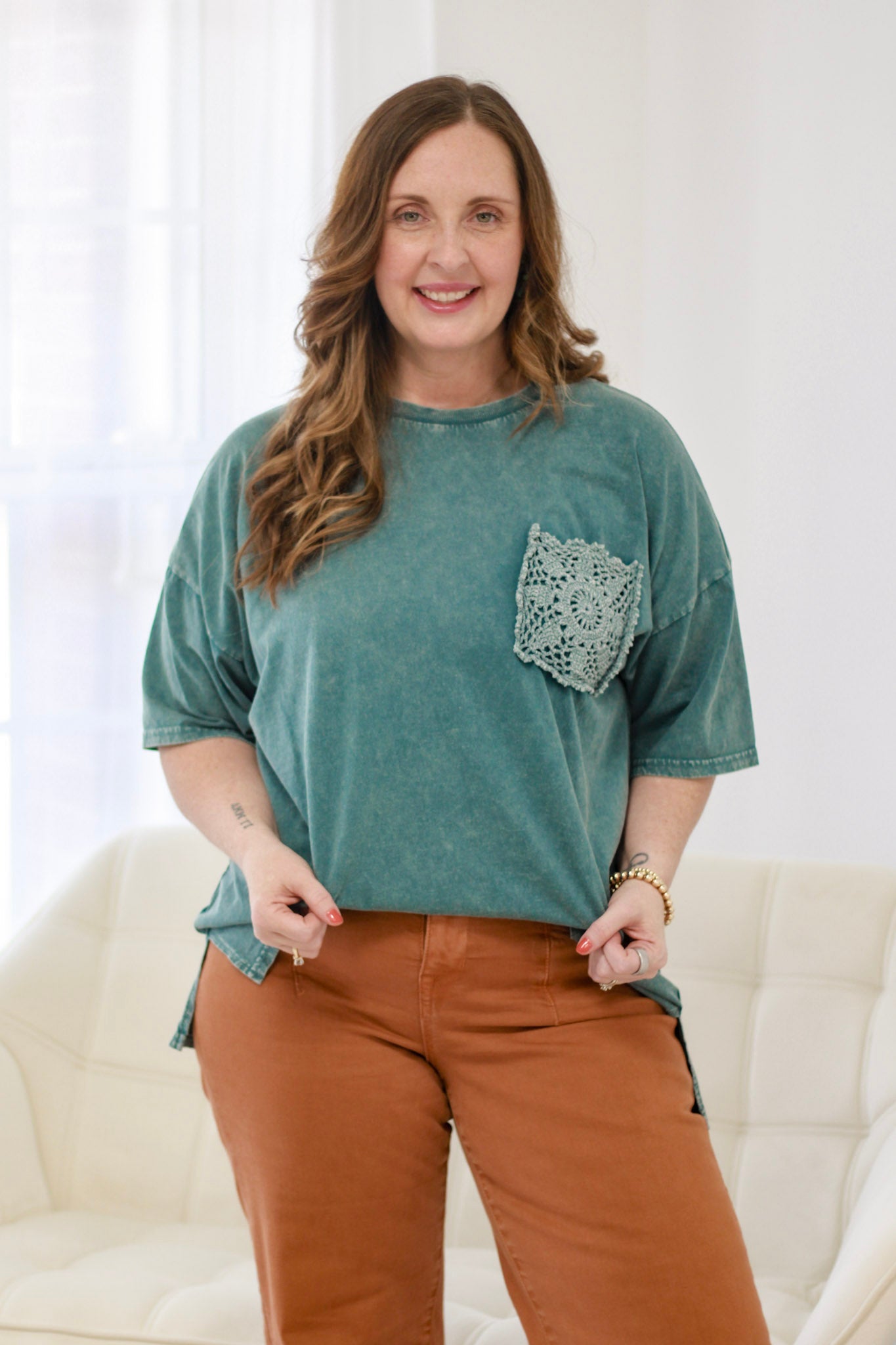 Description: CROCHET POCKET MINERAL WASHED TOP