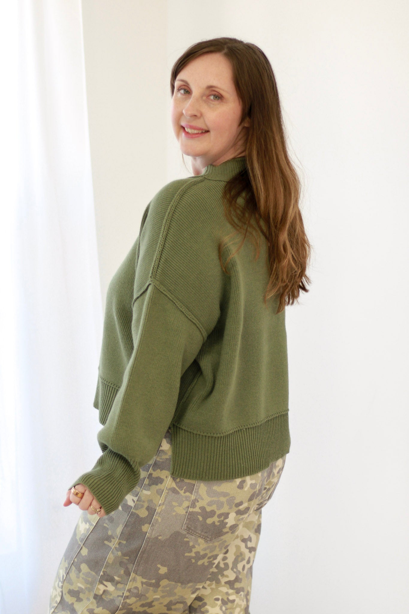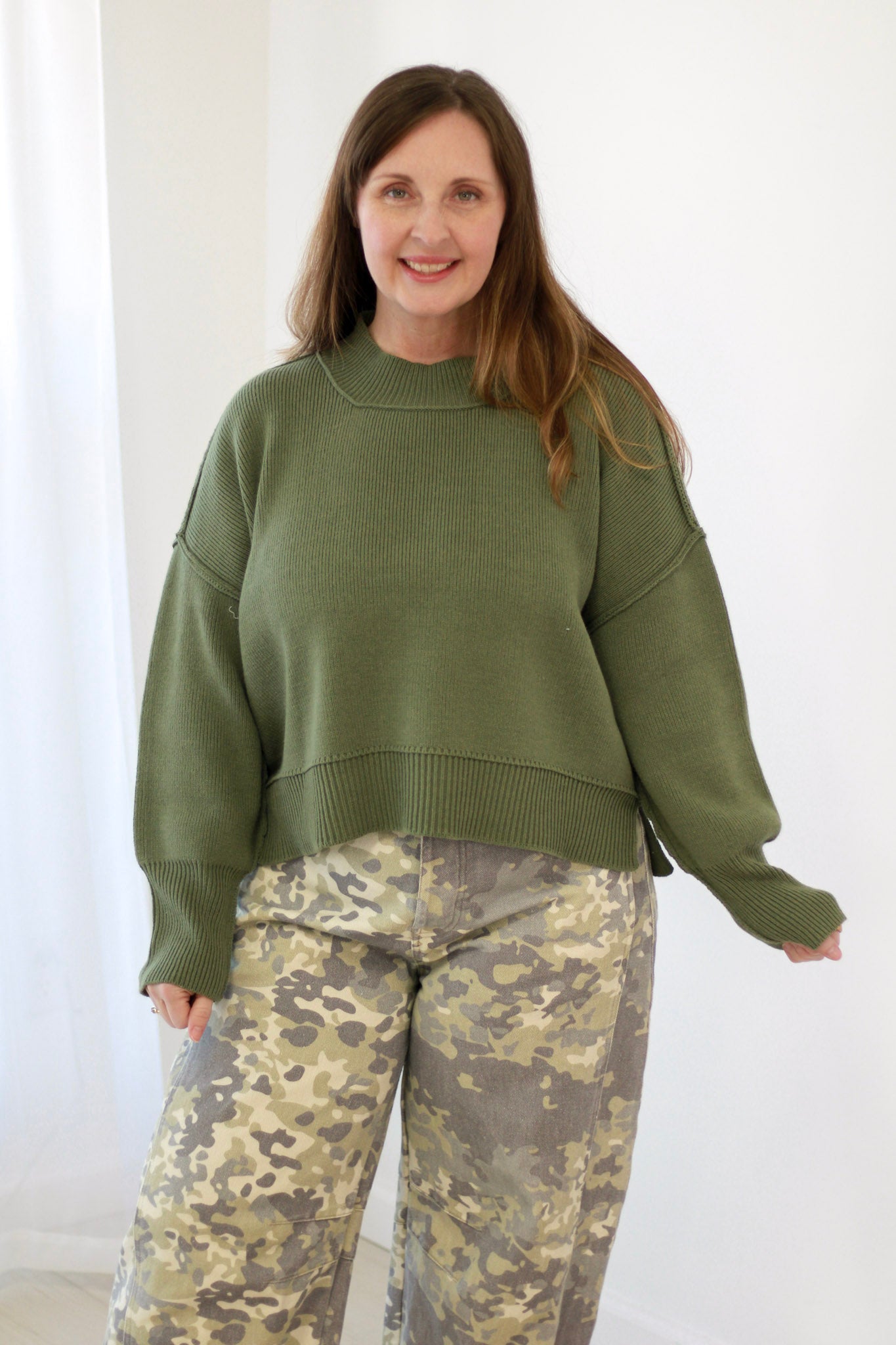 Soft, comfortable, and generously cut, this cropped sweater is a wardrobe essential that pairs beautifully with our camo pants for an effortless look. The relaxed fit makes it perfect for layering or wearing solo, and it's designed to become a closet favorite you'll reach for again and again. Model is wearing size S/M.