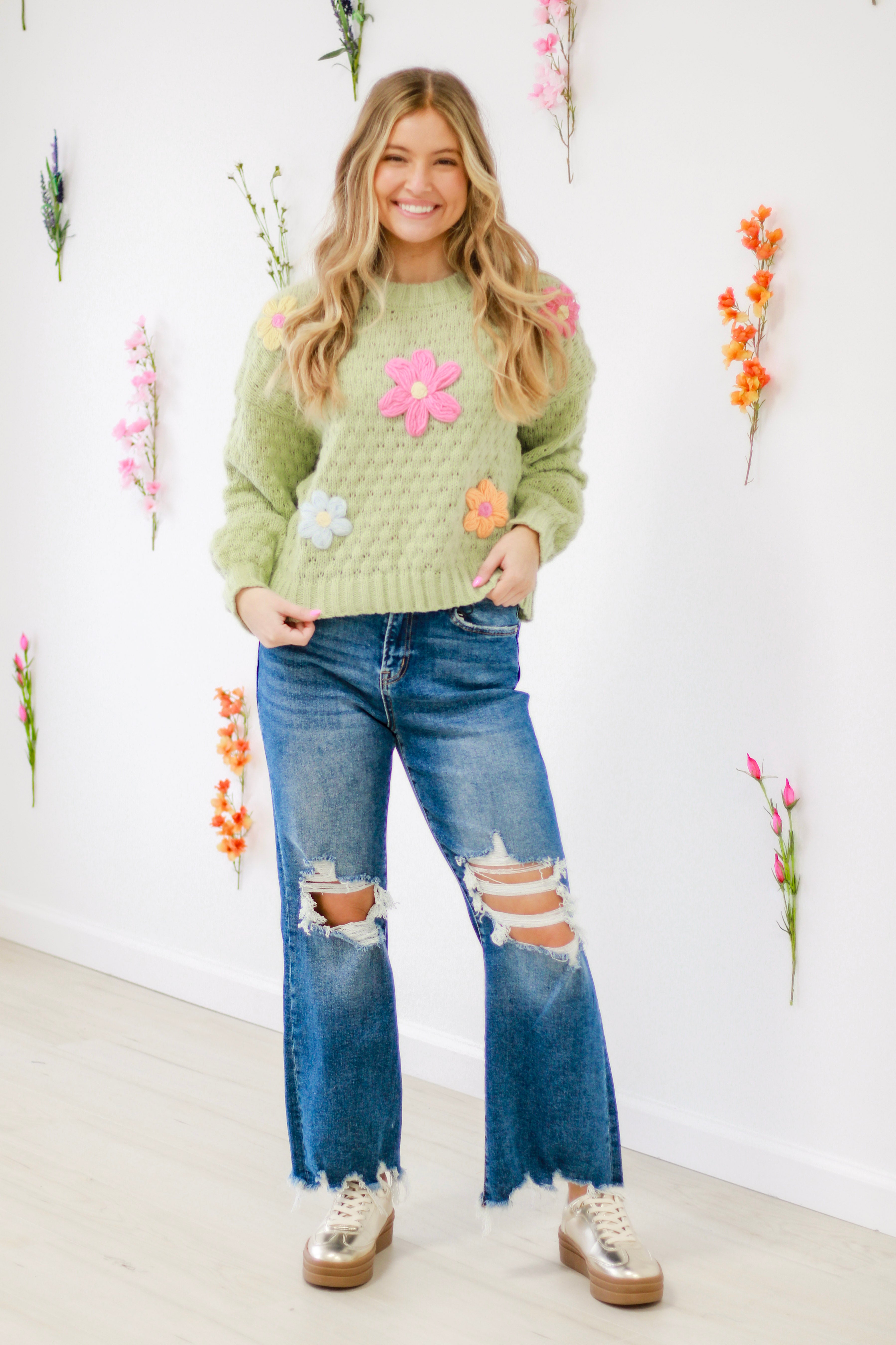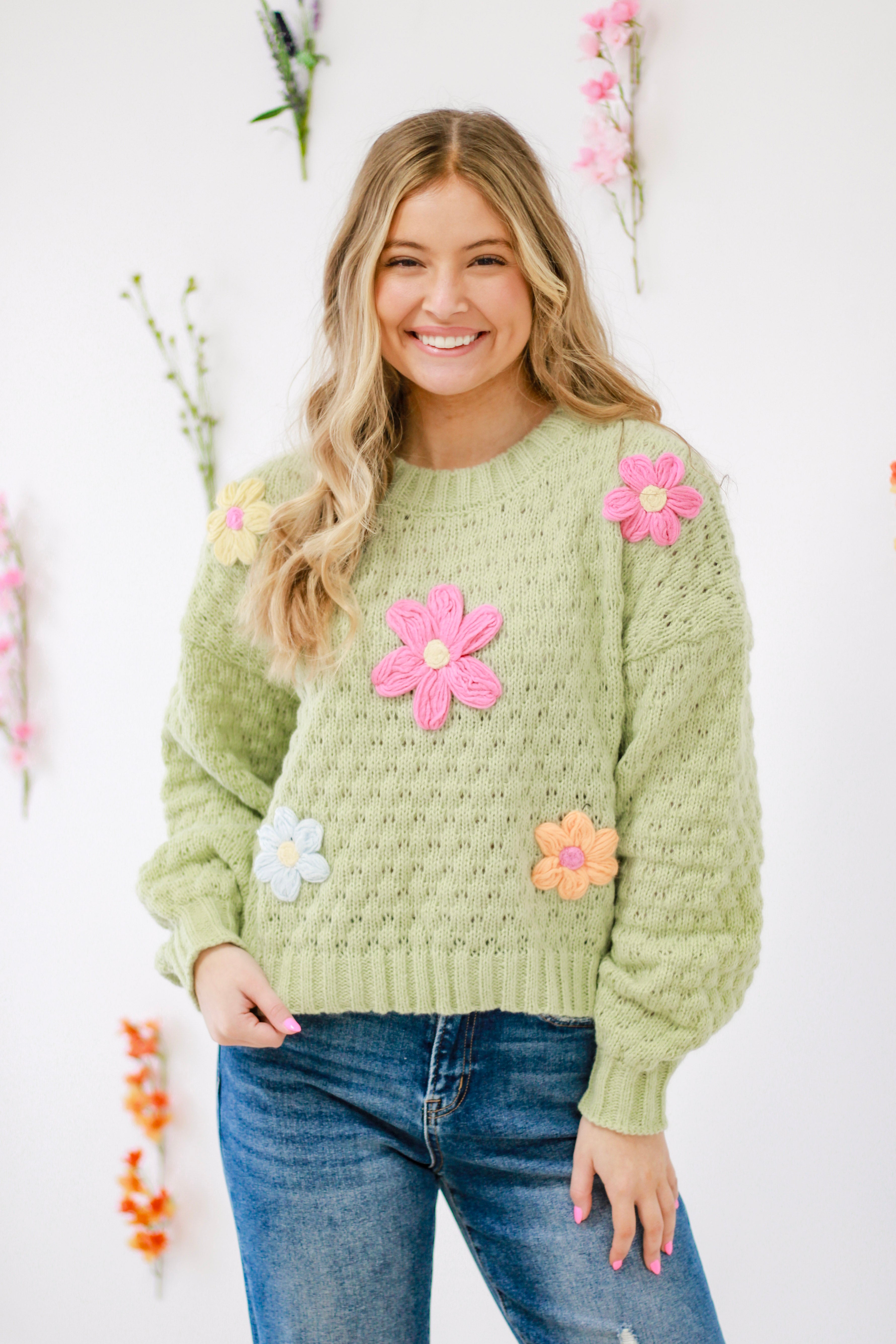- Handmade floral applique oversized knit sweater