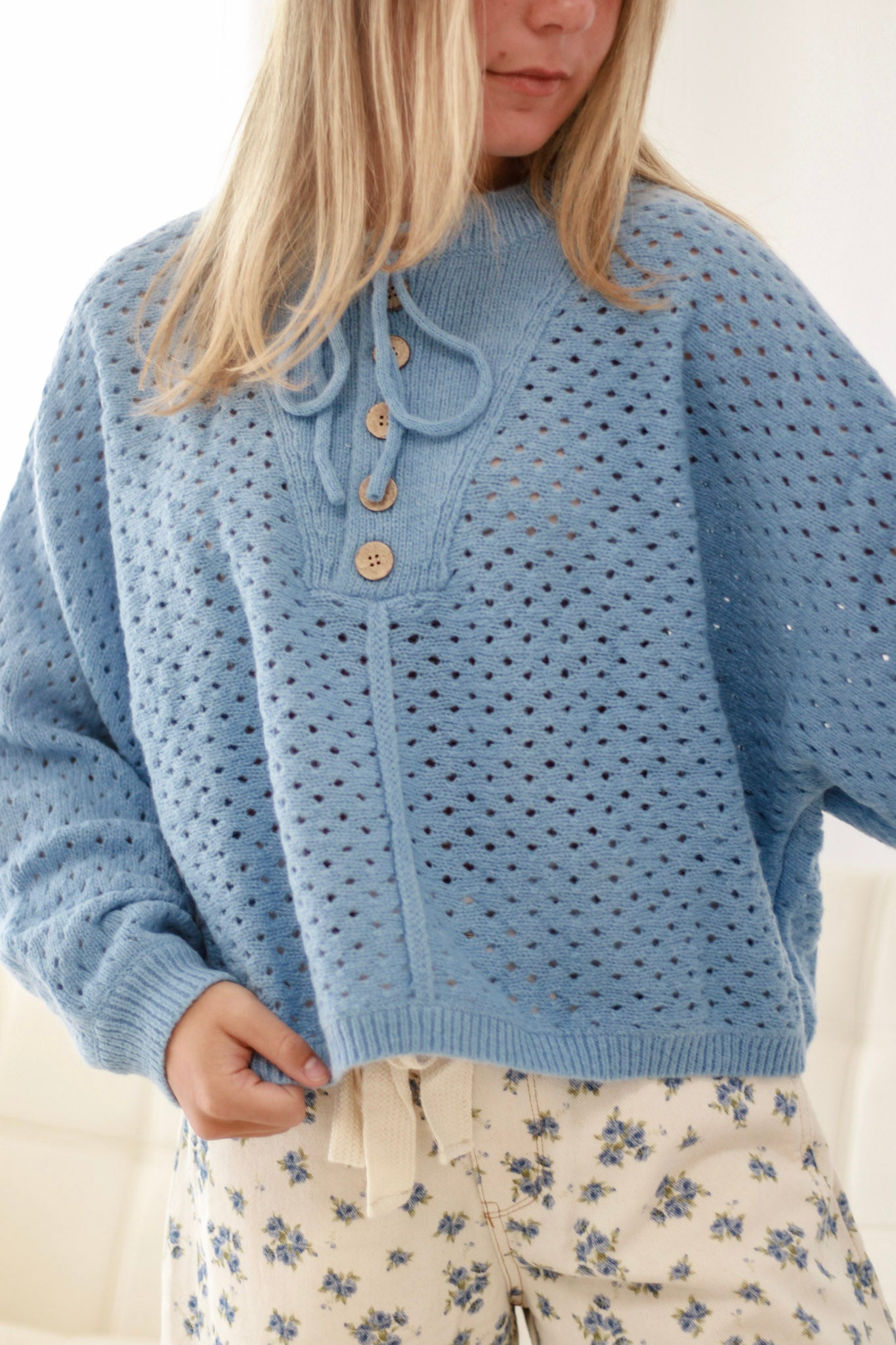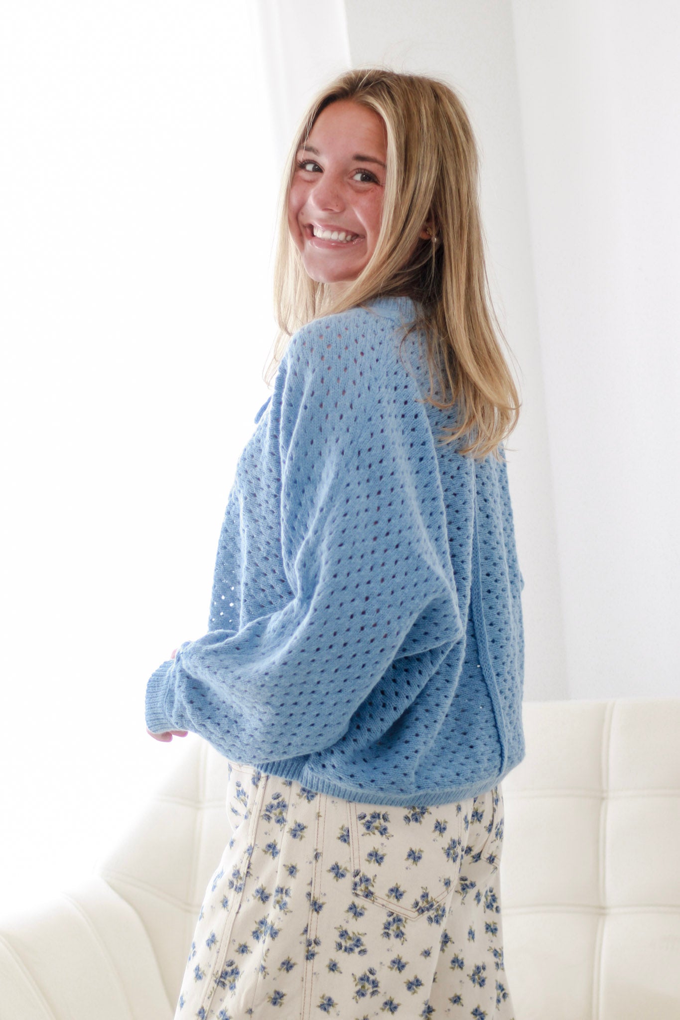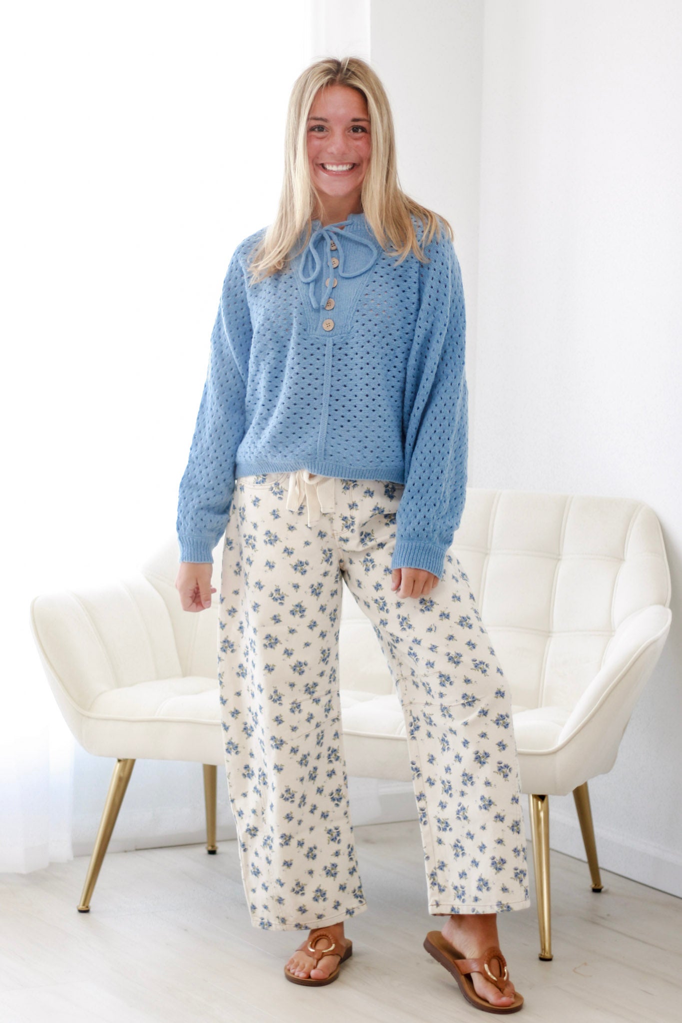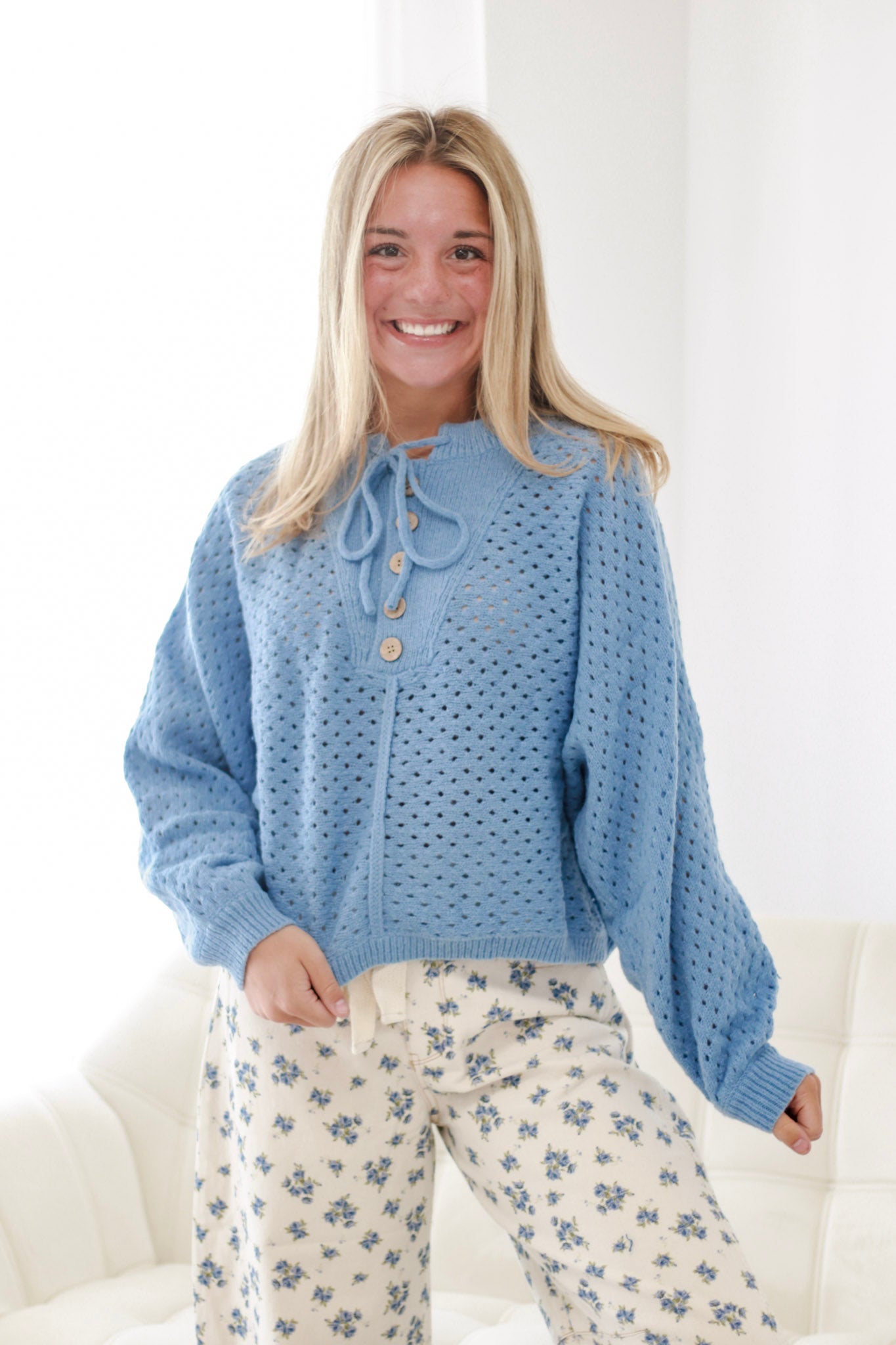 Elevate your wardrobe with the Anything Goes Top, featuring a unique blue textured fabric and stylish cutout details that add a modern edge. The quarter button design and tie neck offer versatile styling options, while the super soft material ensures all-day comfort. This very cute top effortlessly combines fashion and coziness for any occasion.