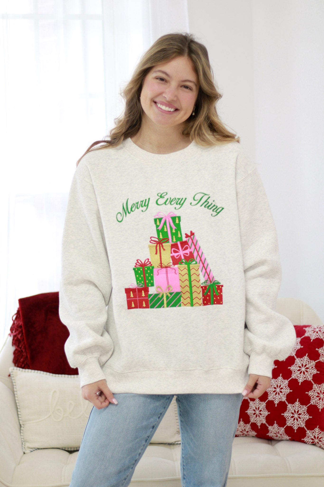 Celebrate the season in style with this adorable embroidered pullover featuring festive holiday designs and cheerful presents. The true-to-size fit ensures a comfortable, flattering wear all season long. Perfect for cozy gatherings, holiday parties, or casual winter days.