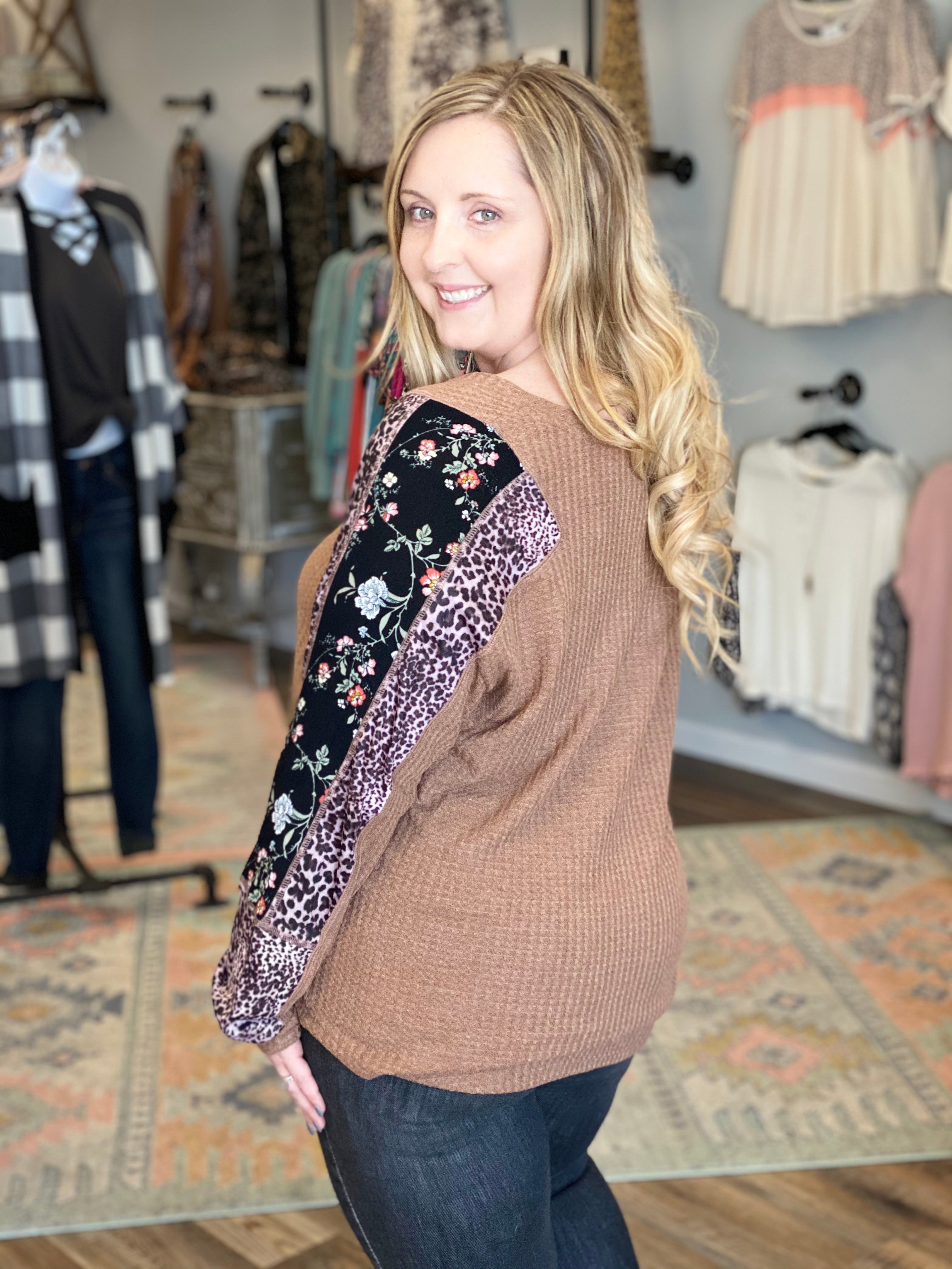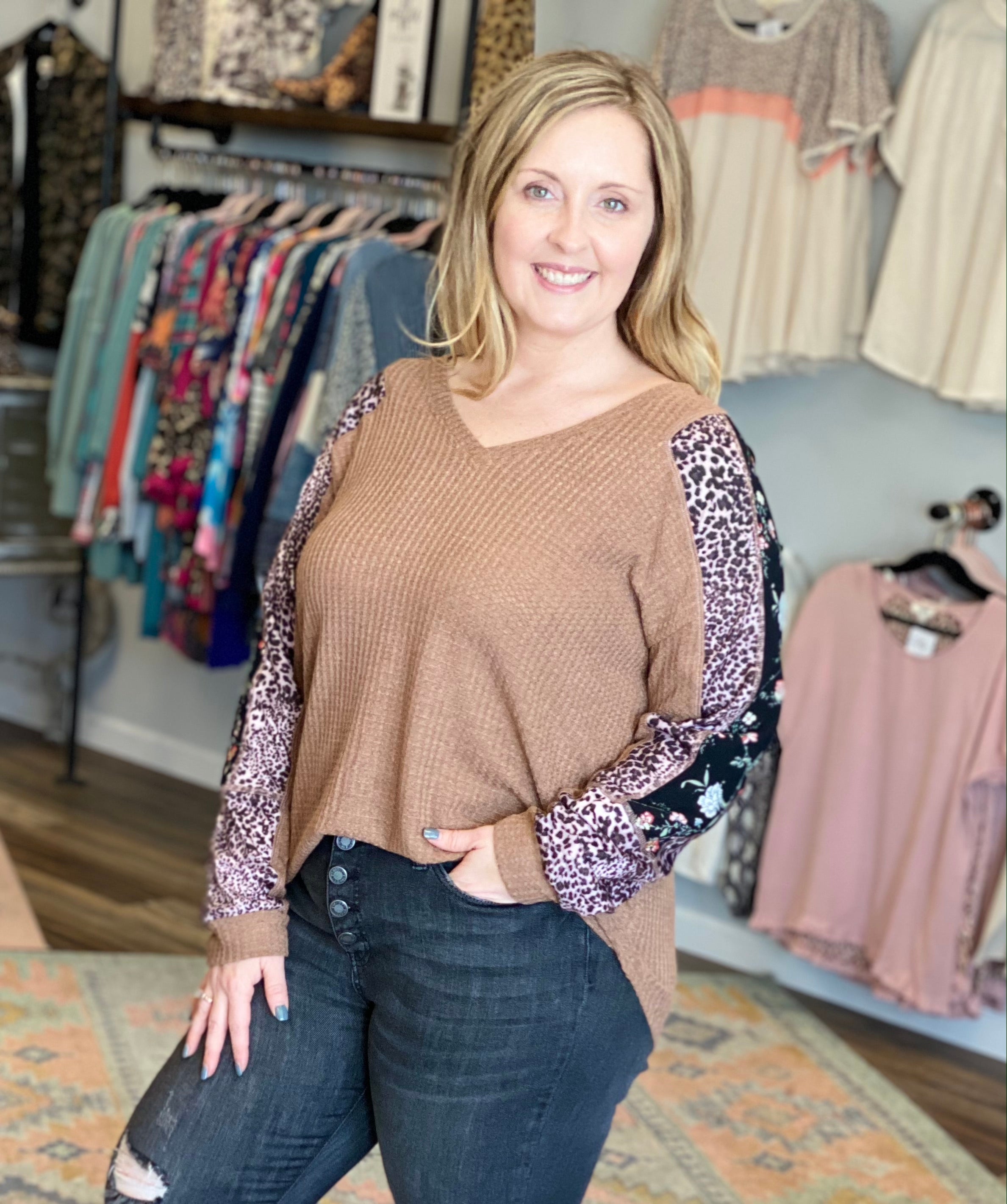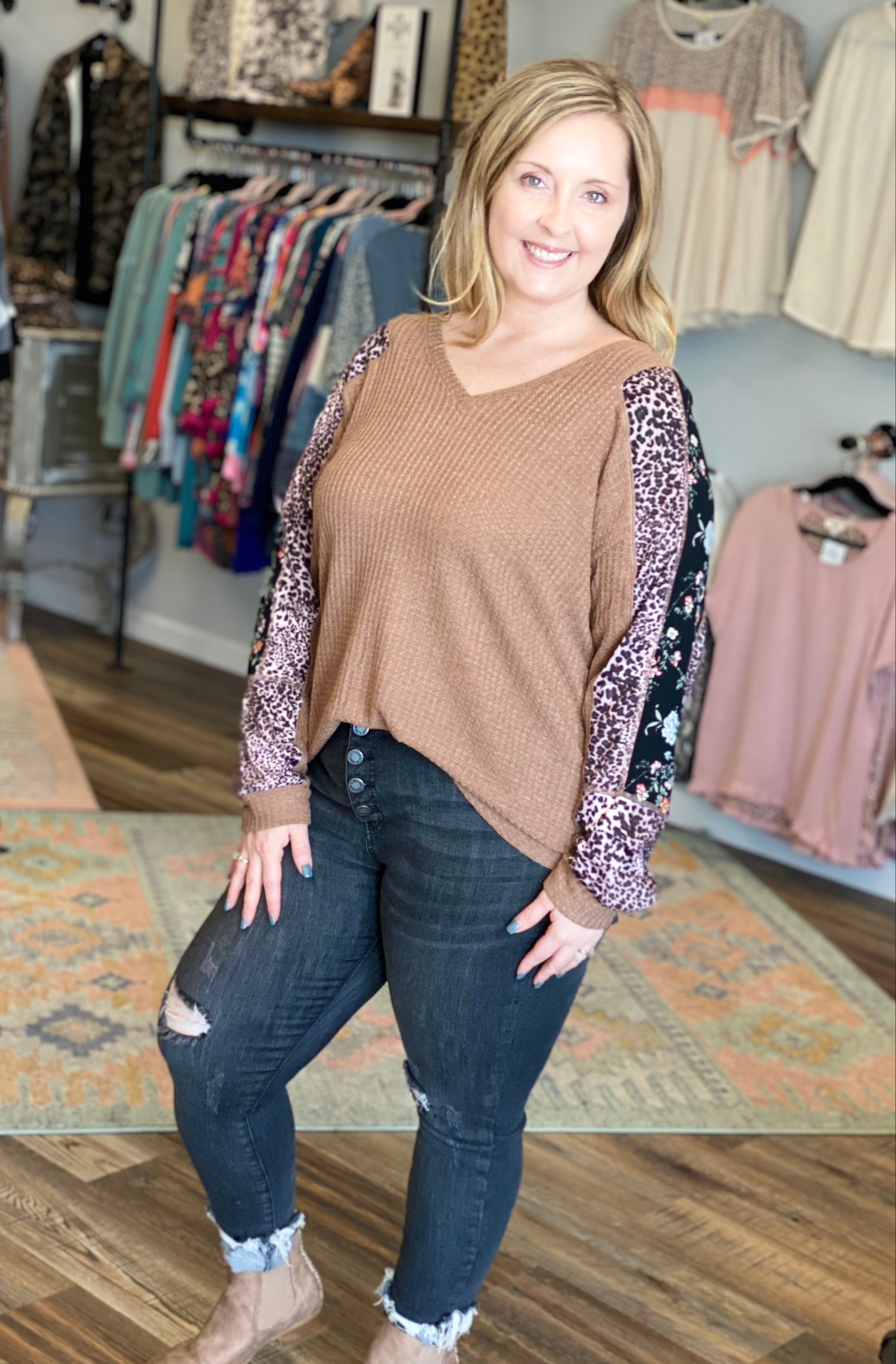 Need a perfect on the go top? This is it! Comfort and style is the name of the game with this one. The solid mocha base is an awesome waffle knit while the sleeve details sets it apart.