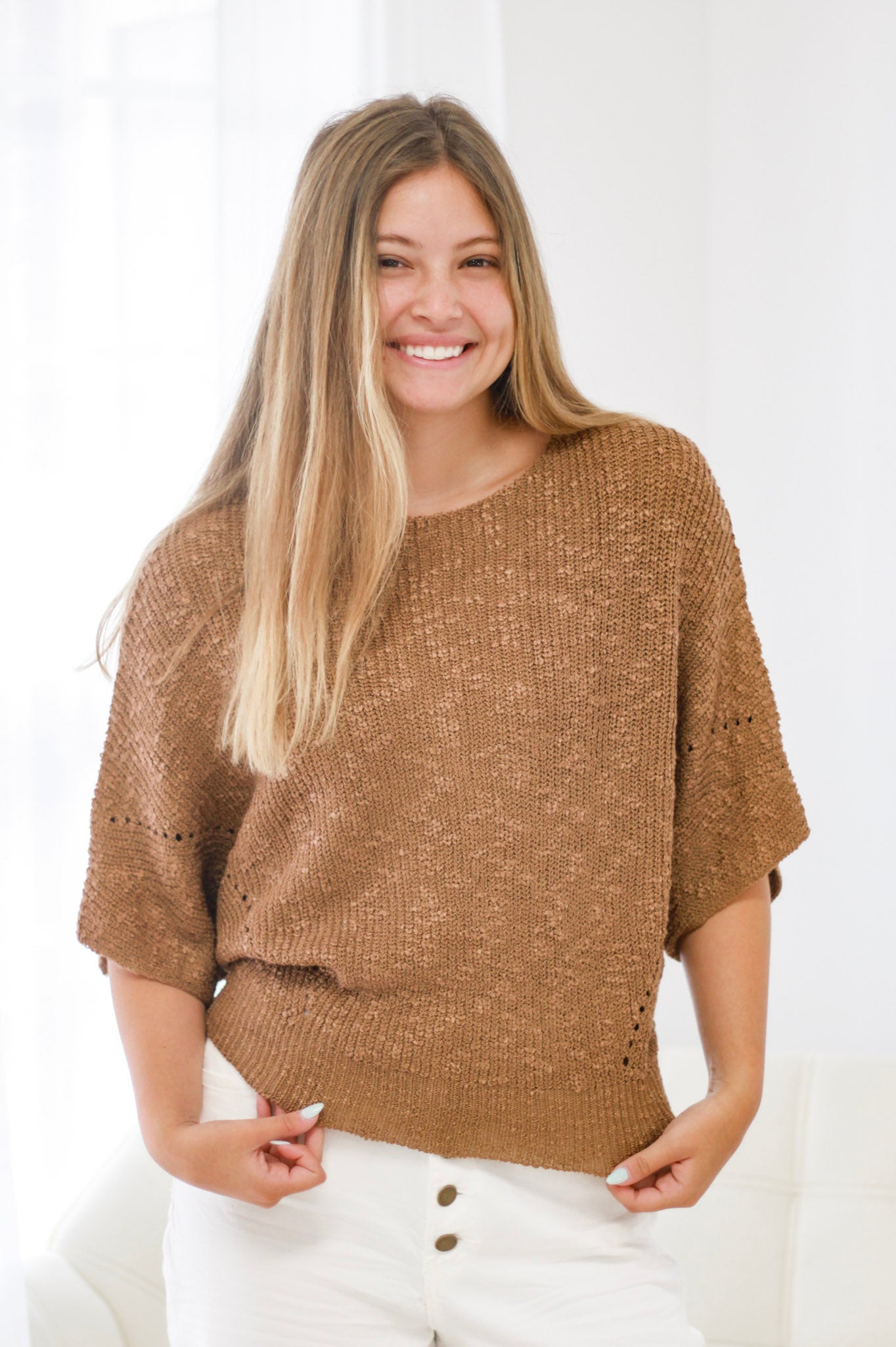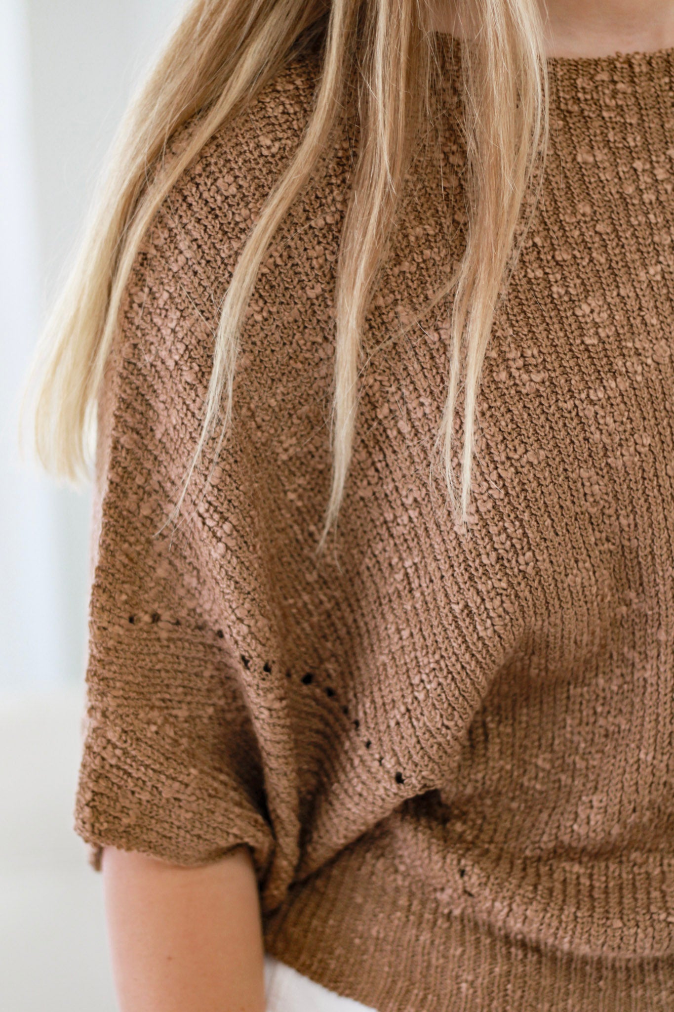 The Locked In Coco Top features a super soft knit fabric with a trendy coco hue, designed for all-day comfort. Its short sleeves and stylish cutout detail create an adorable, flattering fit that complements any wardrobe. Perfect for those seeking a blend of modern style and cozy wearability, this top is true to size for effortless styling.