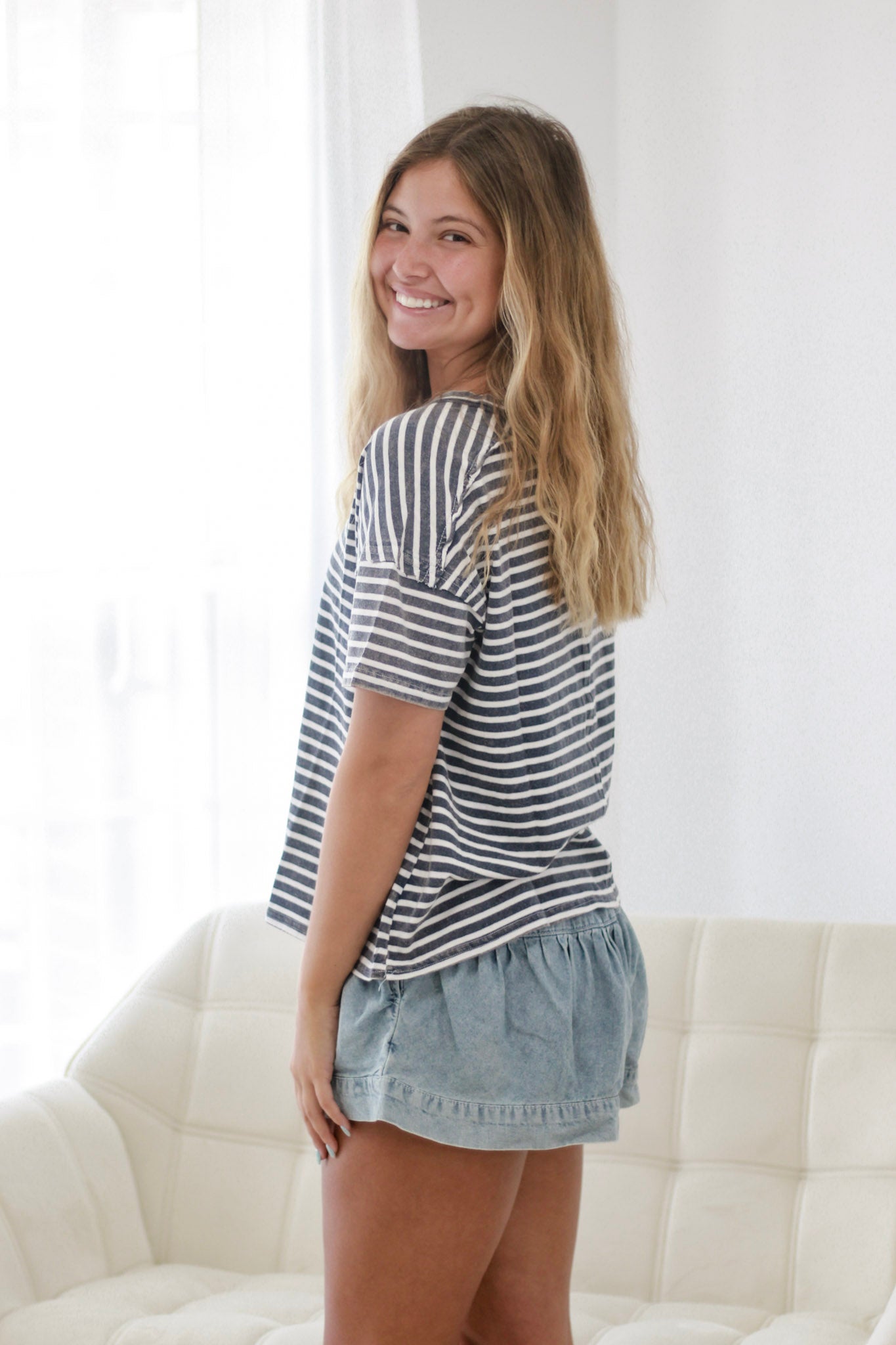 - Striped navy and white top