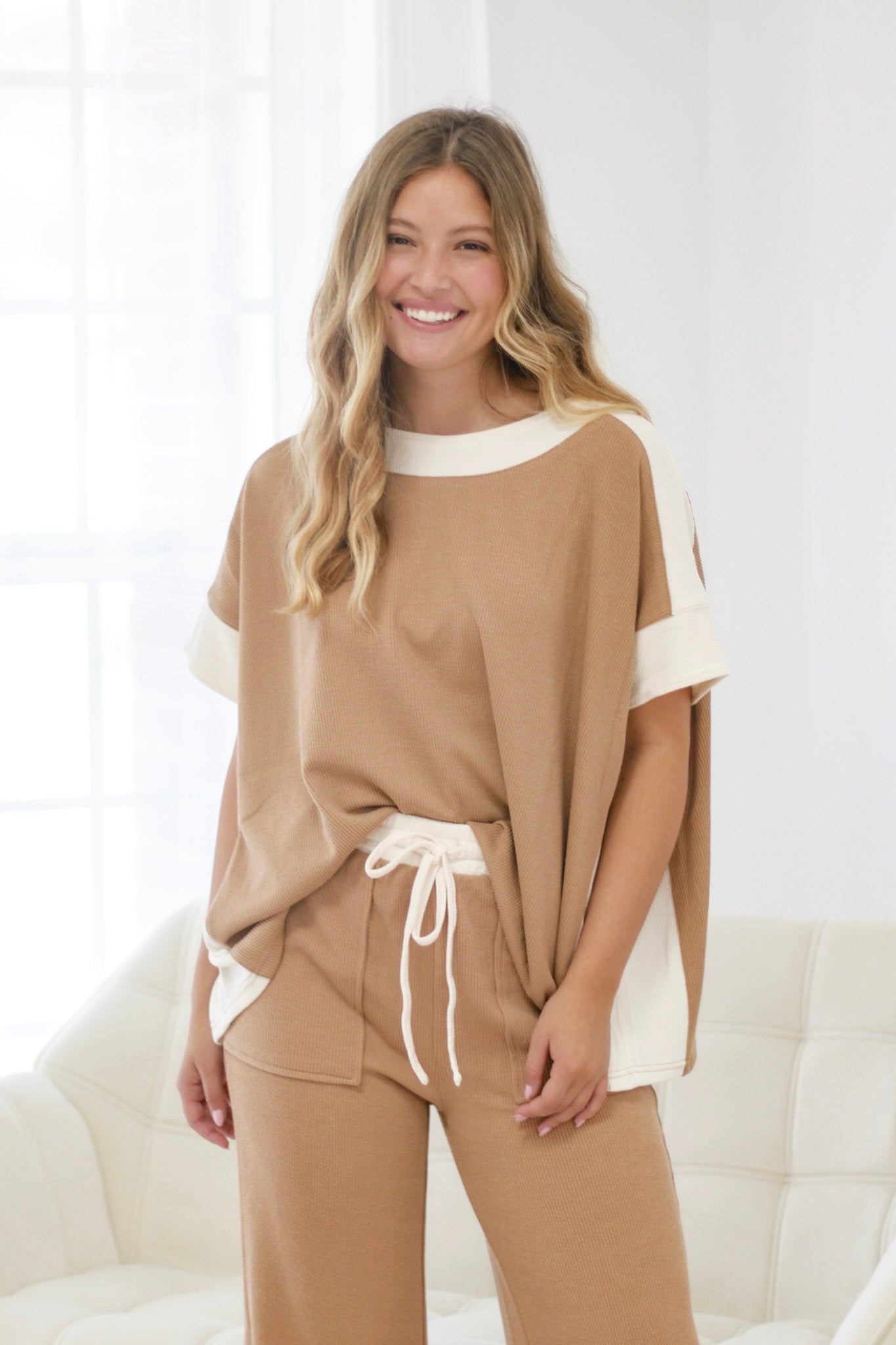 This relaxed top features a textured fabrication, contrast ribbed paneling at the neckline and sides, wide cut short sleeves, and a boxy silhouette for a laid back yet elevated look.