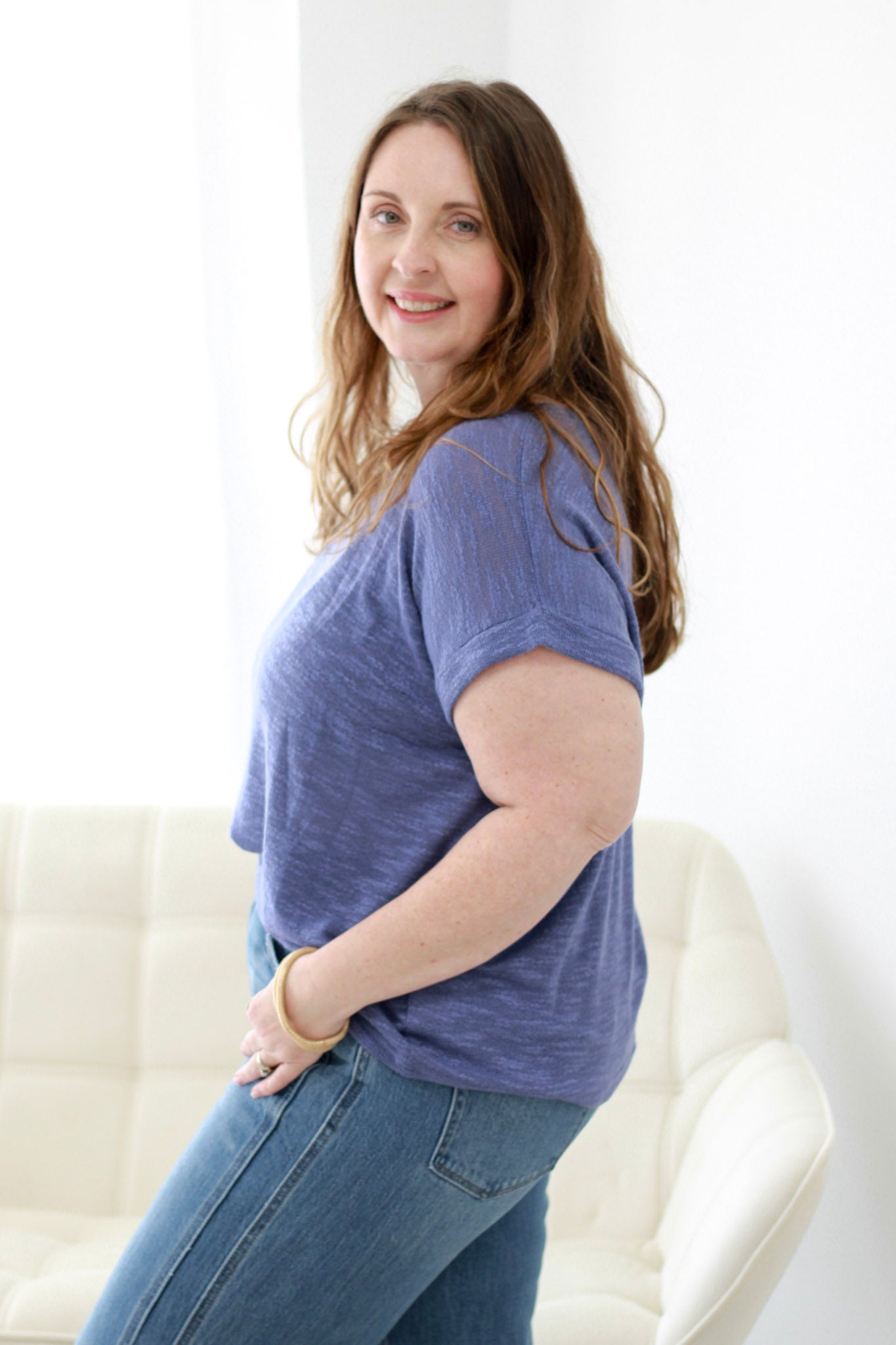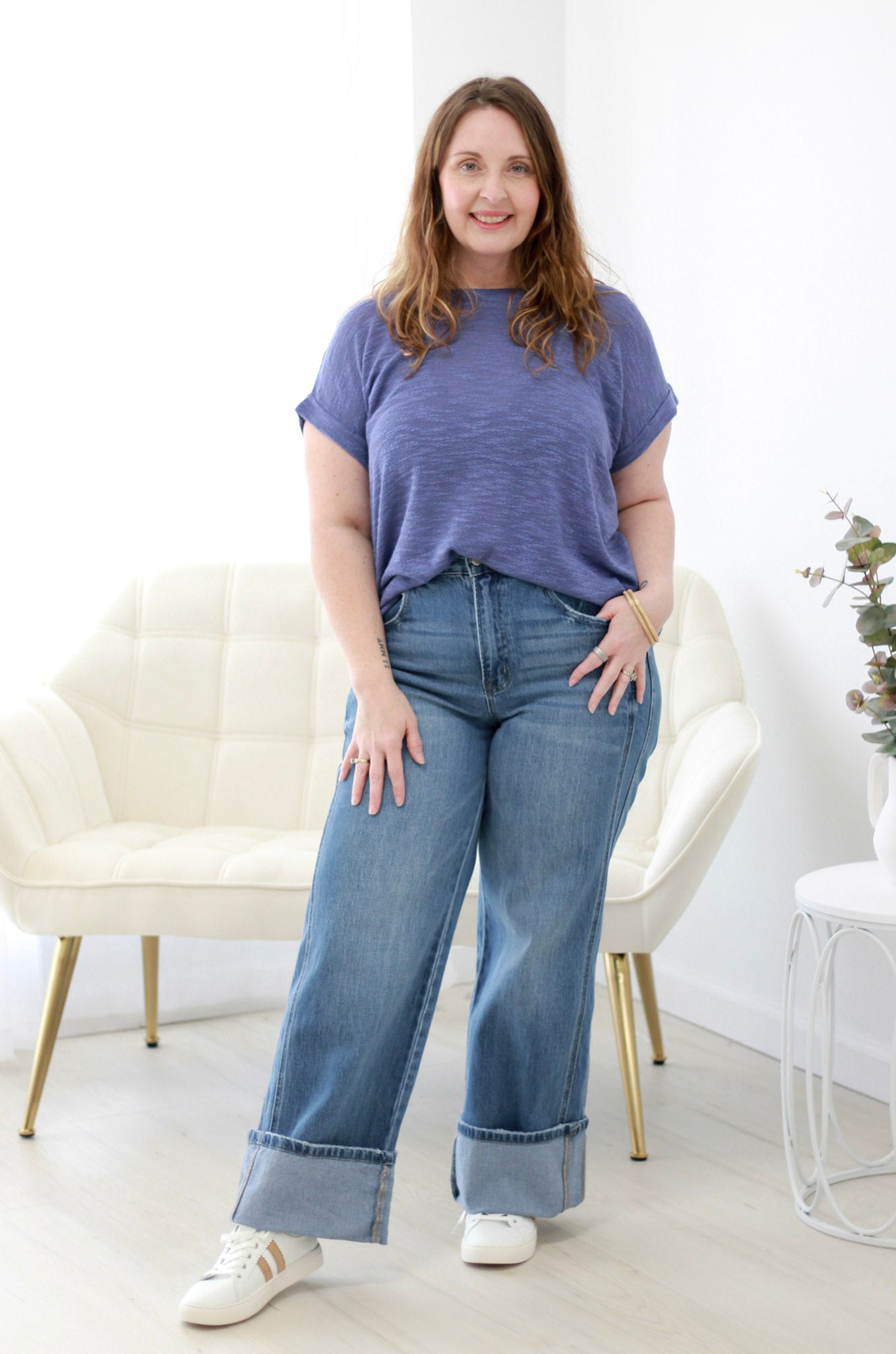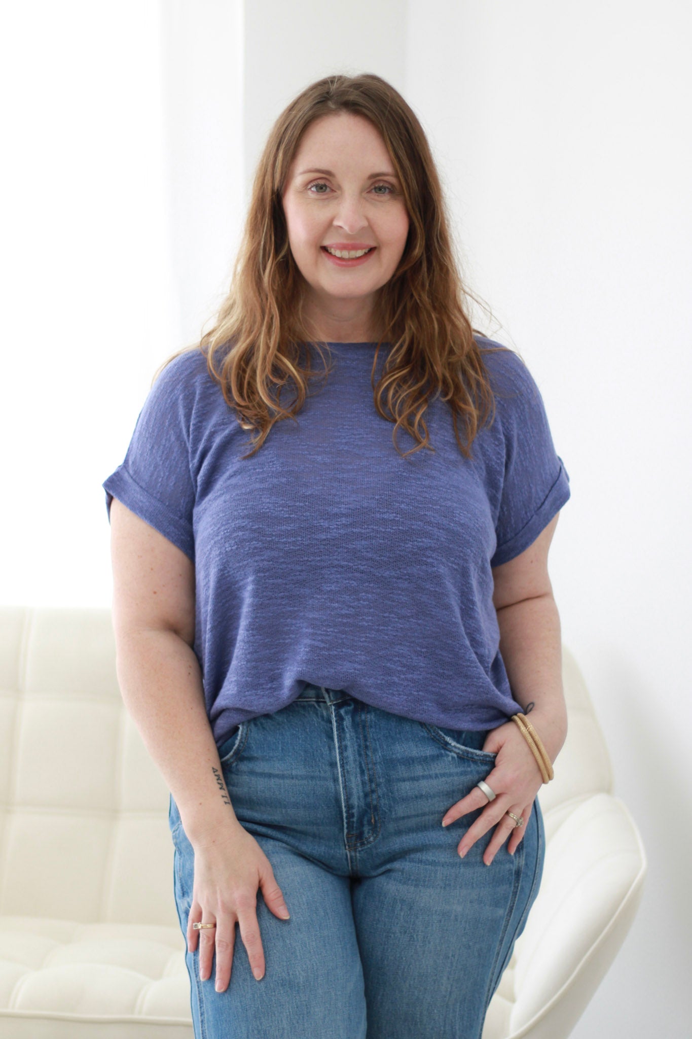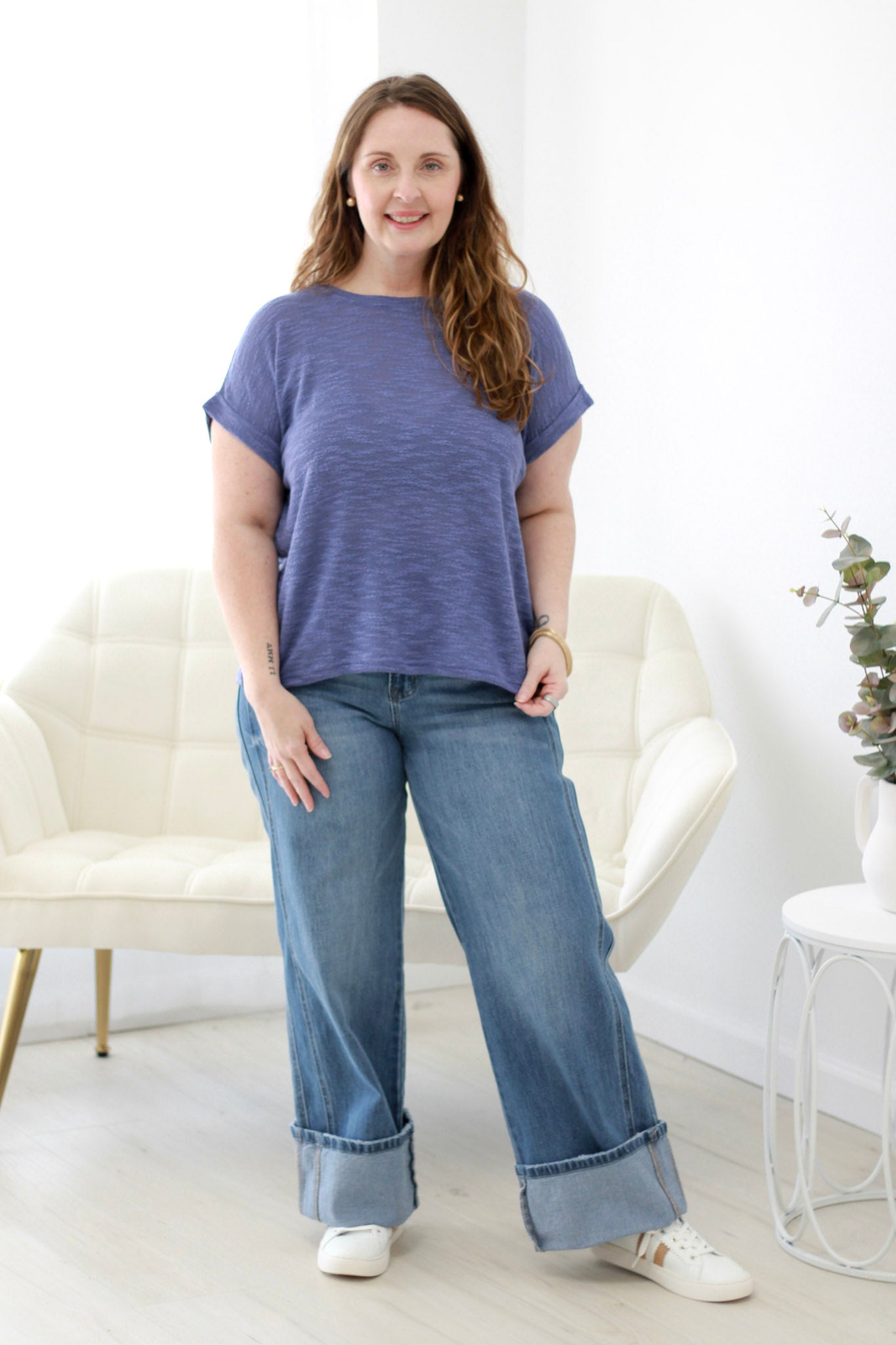 This soft Hacci slub fabric offers a comfortable, cozy feel perfect for everyday wear. The rolled-up sleeves add a relaxed, stylish touch. It pairs effortlessly with jeans or skirts for a casual yet polished look.