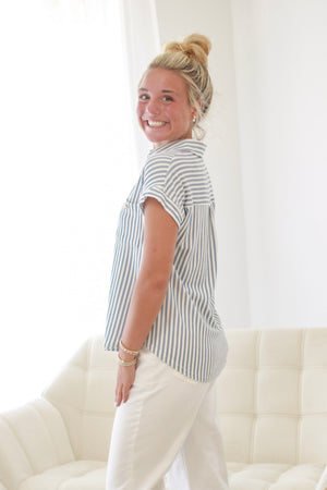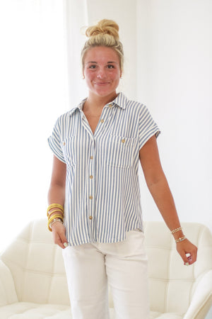 - Blue/white striped top