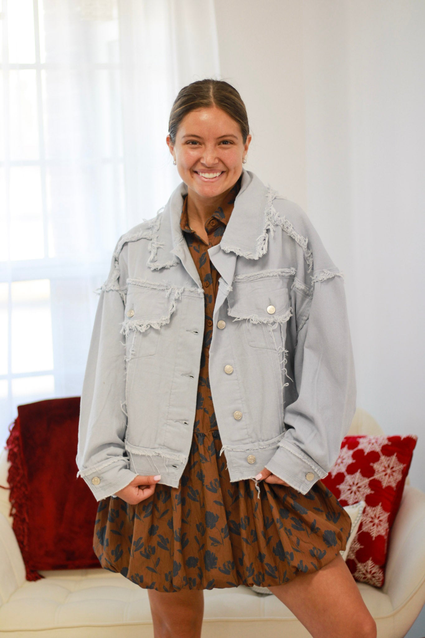Distressed raw edges and a cute silhouette make this denim jacket a standout piece that pairs effortlessly with any outfit. The generous fit ensures comfort without sacrificing style, while the relaxed cut flatters various body types. A versatile wardrobe essential that delivers both edge and wearability.