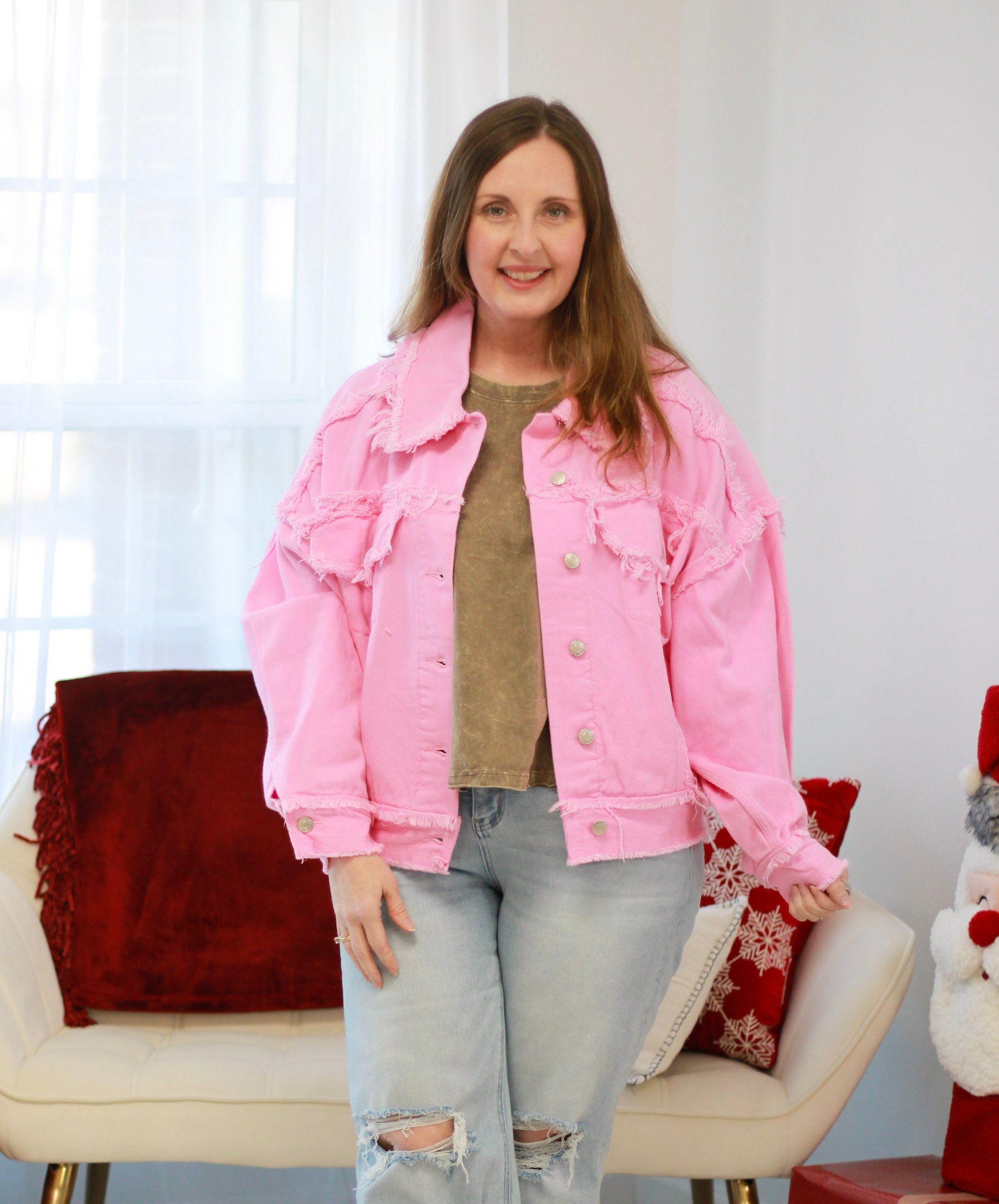 Distressed raw edges and a cute silhouette make this pink denim jacket a standout piece that pairs effortlessly with any outfit. The generous fit ensures comfort without sacrificing style, while the relaxed cut flatters various body types. A versatile wardrobe essential that delivers both edge and wearability.