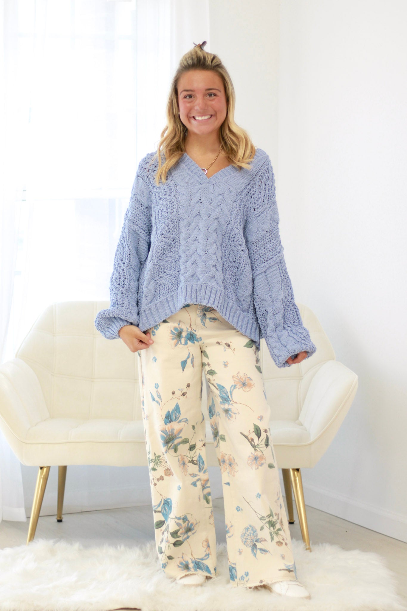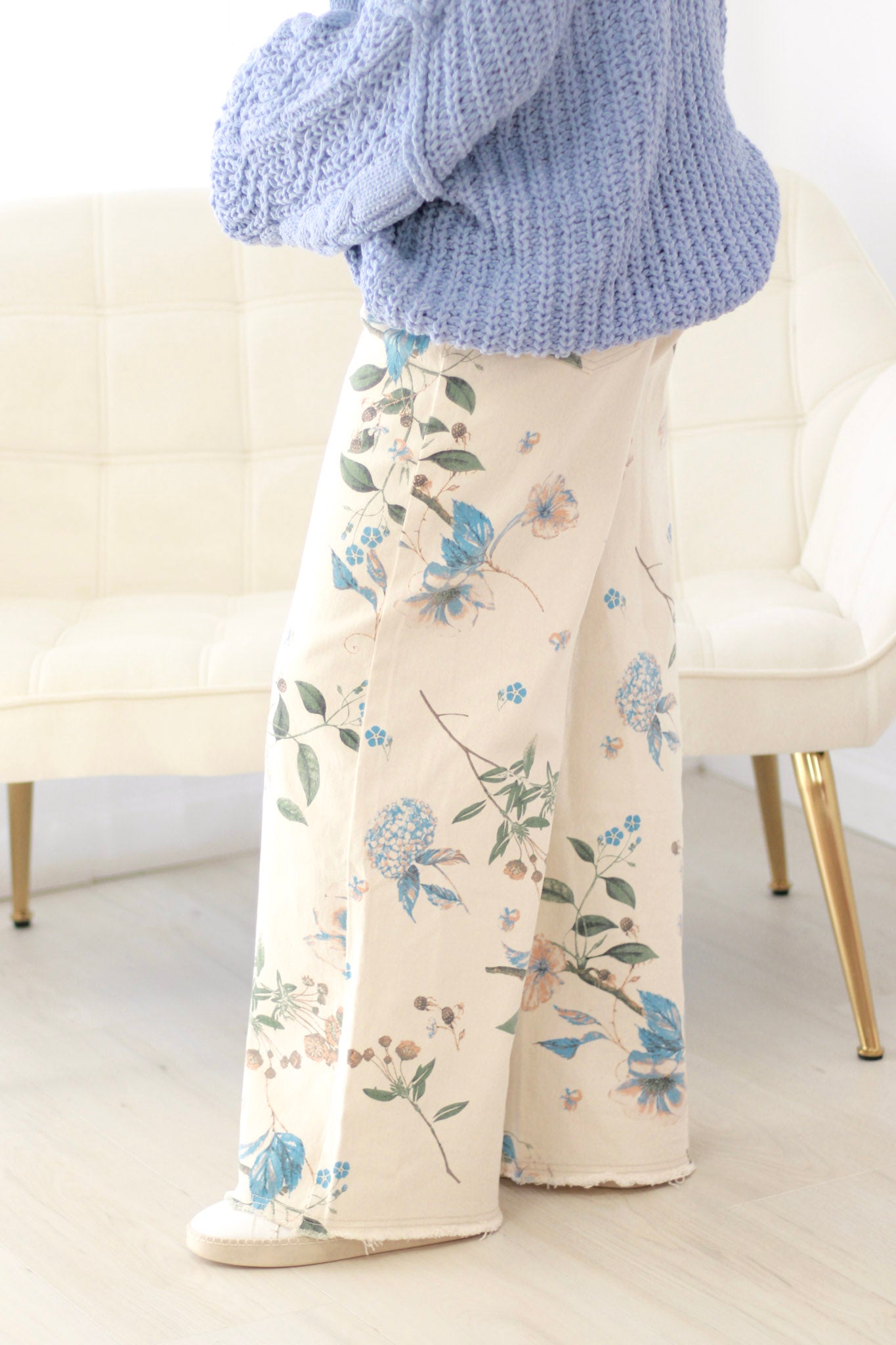 These high-waisted pants feature a wide-leg cut and are crafted from stretch washed twill for comfort and style. An all-over floral print adds vibrant charm, while raw hem detailing enhances their casual appeal. Designed with a classic five-pocket style and secured with a zip fly and button closure, they combine fashion and practicality effortlessly.