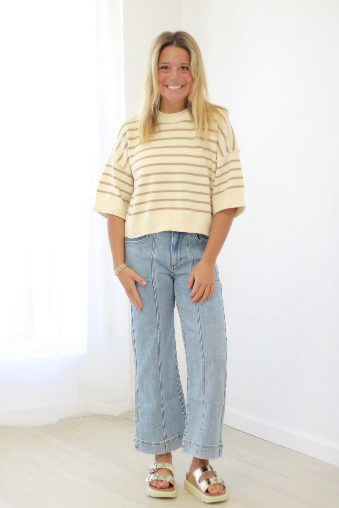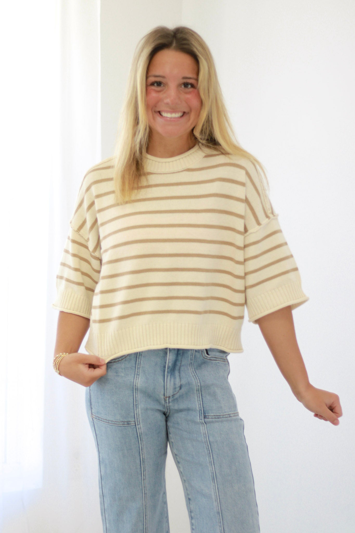 Effortless style meets everyday comfort in this classic striped sweater. The warm khaki and cream stripe pattern and relaxed silhouette create a versatile piece that works from coffee runs to casual dinners, making it an essential addition to your sweater collection.
