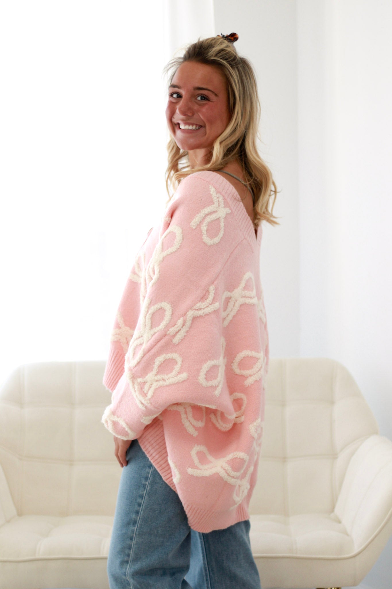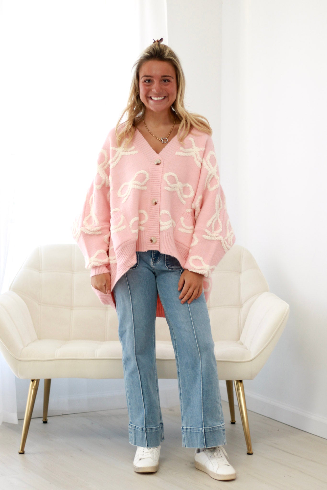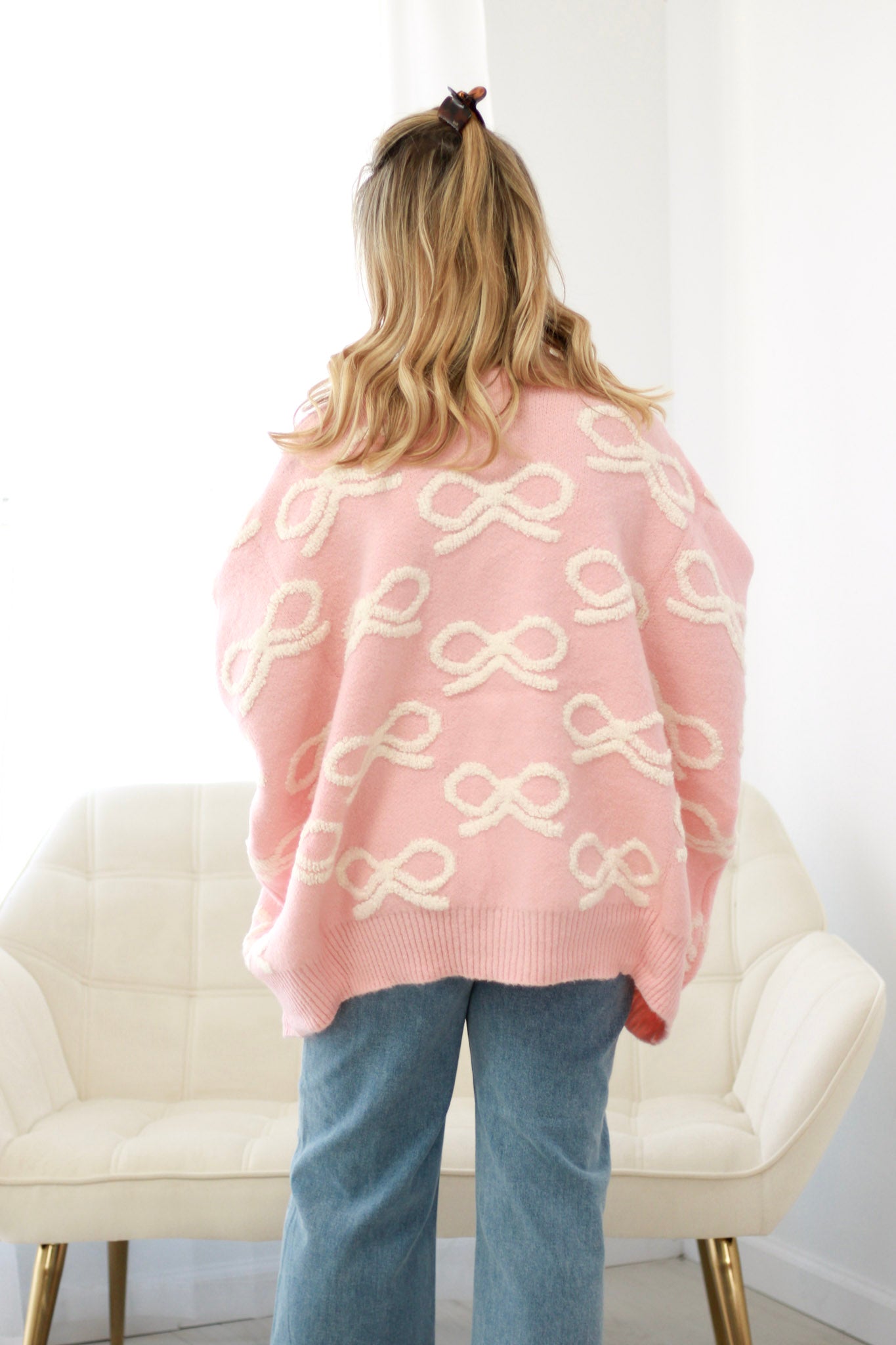 This oversized button-up cardigan features an adorable bow print in soft baby pink, perfect for layering or wearing solo. The relaxed, generous fit offers comfort and effortless style for any casual occasion. A sweet staple that pairs beautifully with everything in your wardrobe.