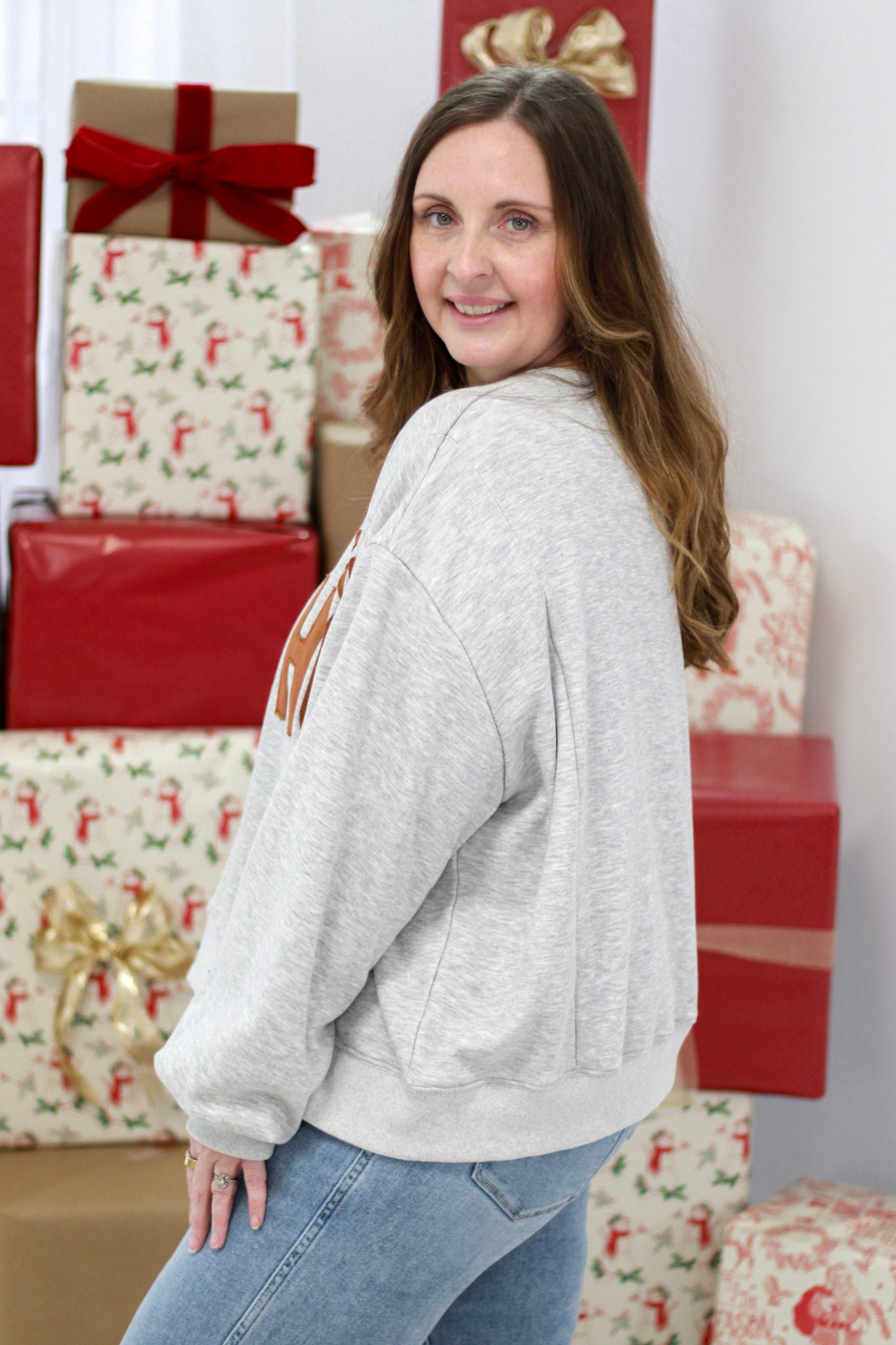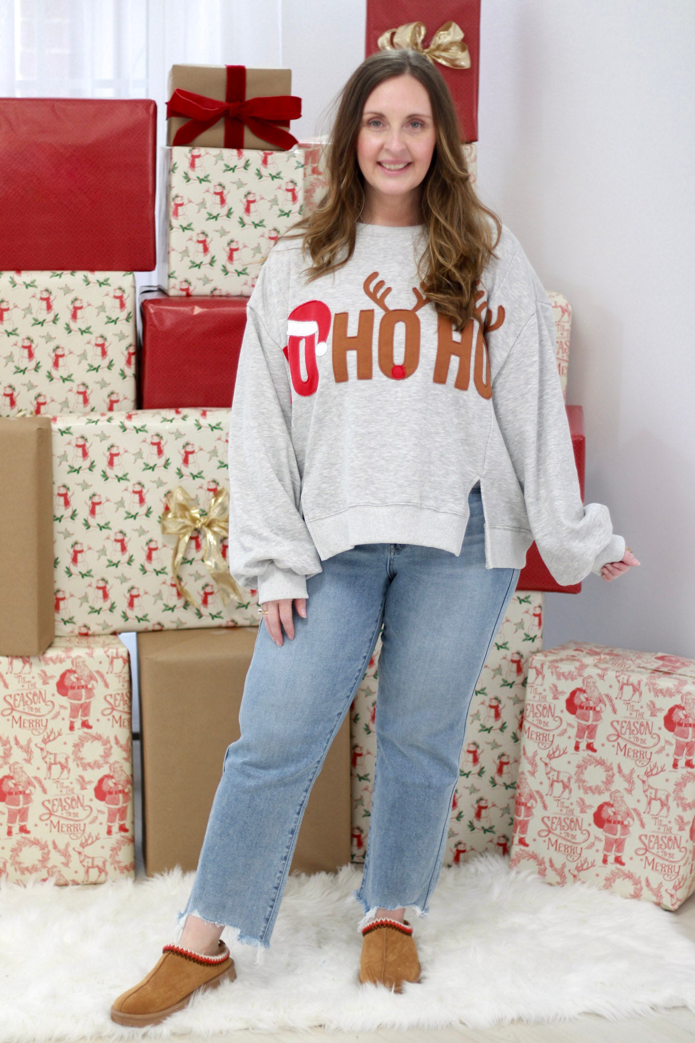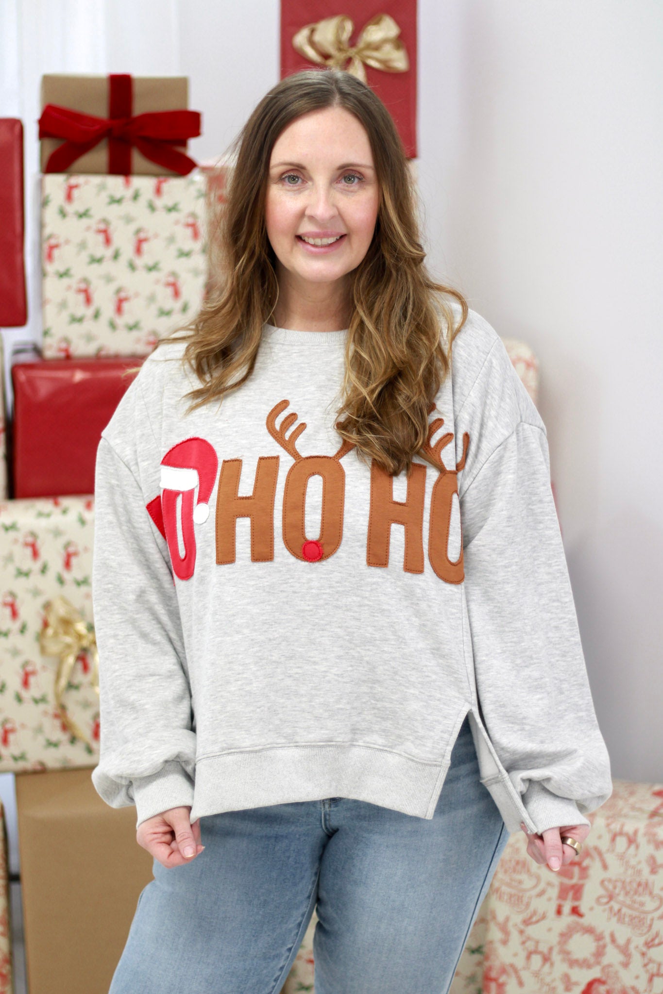 Spread holiday cheer in this playful pullover featuring a cheerful "ho ho ho" design paired with festive reindeer antlers and a Santa hat. The generous fit ensures all-day comfort, while convenient side slits add practical style. Perfect for cozy seasonal celebrations or casual winter gatherings.