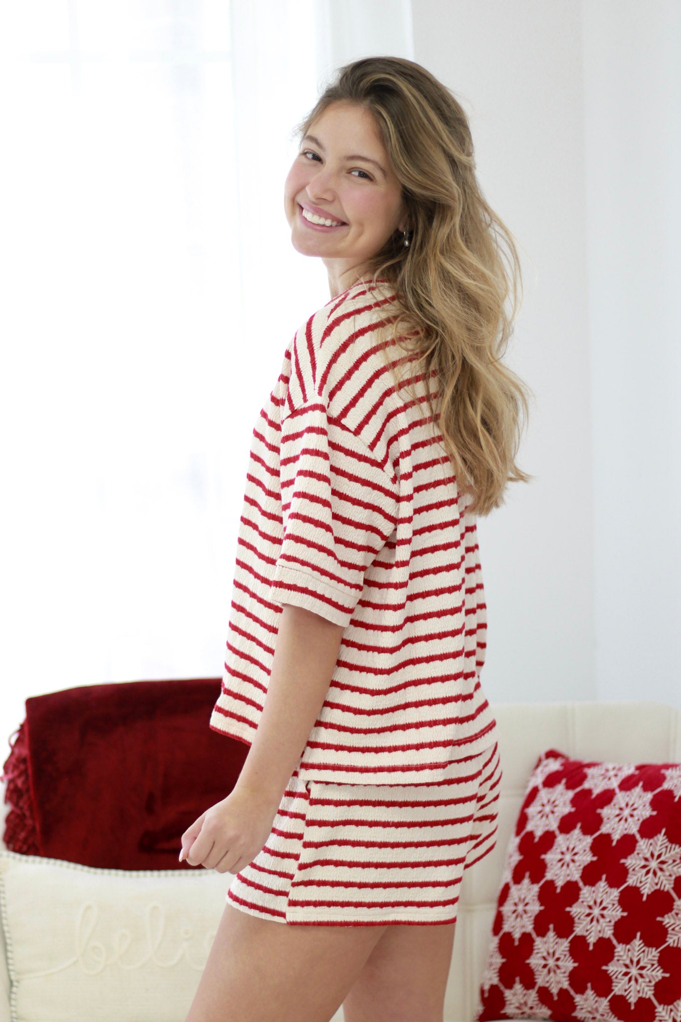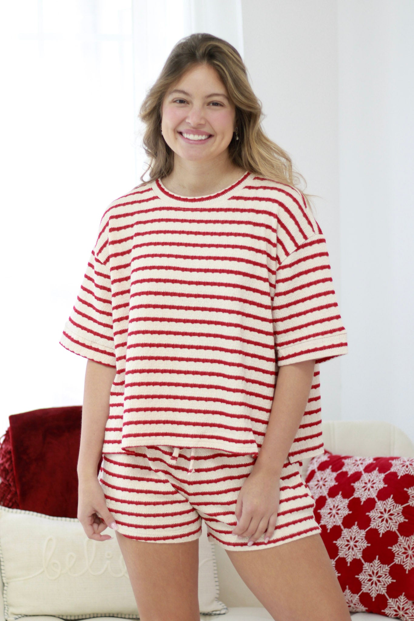 Cozy red and cream stripes make this pajama set perfect for lounging or bedtime. The soft fabric feels gentle against your skin while the classic striped pattern adds playful charm to your sleepwear collection. Mix and match the pieces for versatile comfort throughout your day. True to size fit.