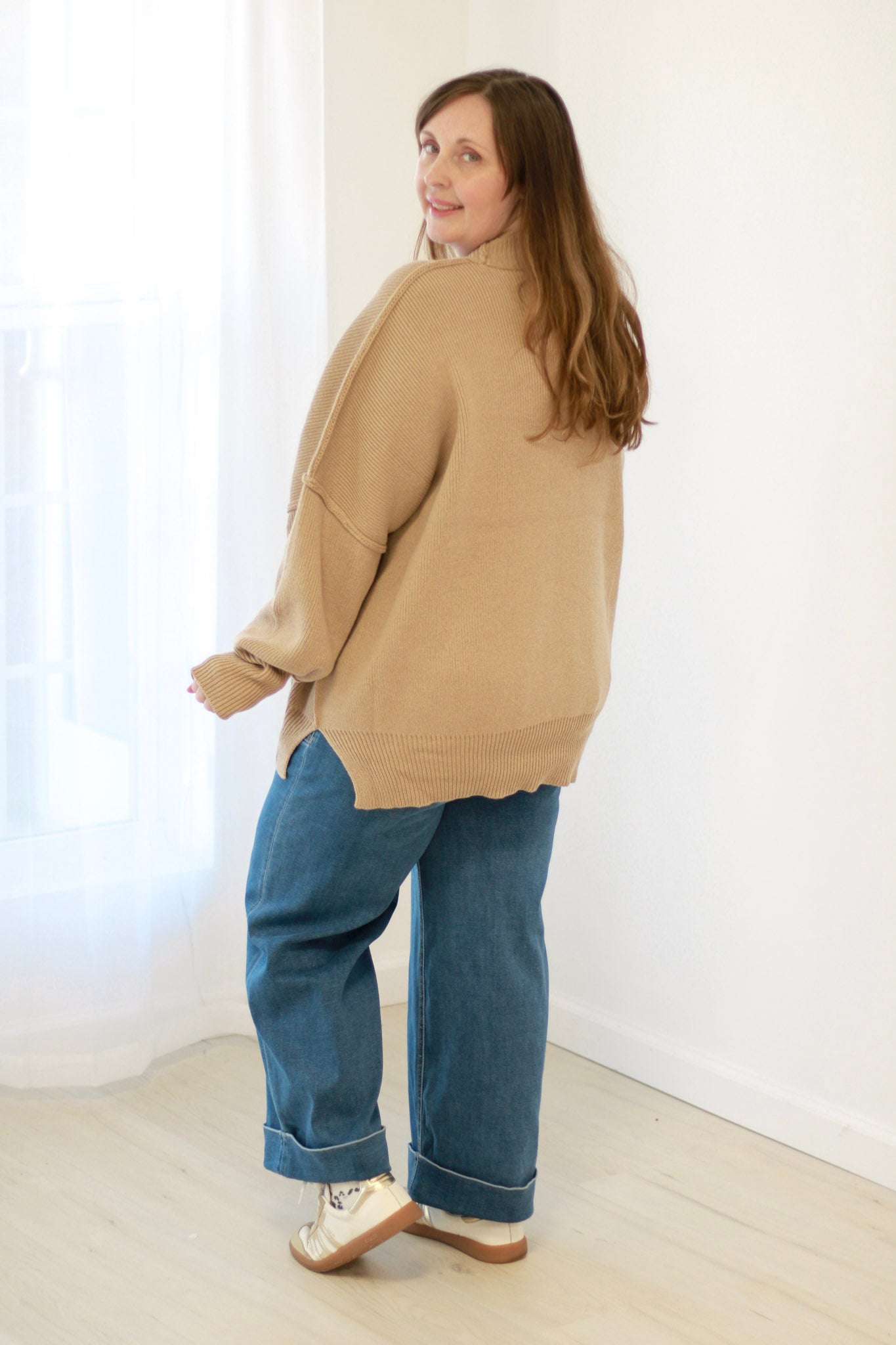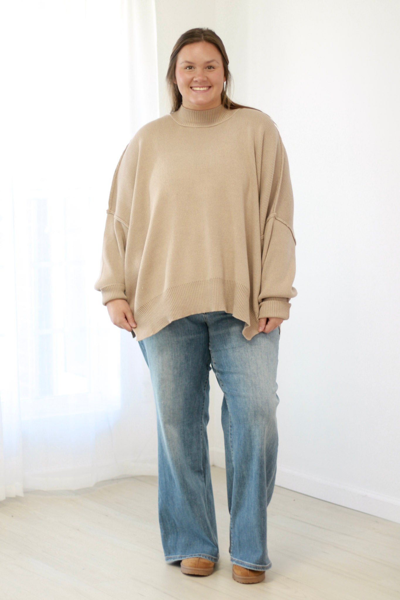 This oversized sweater features convenient side slits for added movement and style. Crafted from low gauge heavyweight fabric, it offers exceptional warmth and durability. Enjoy a cozy fit that balances comfort with a modern silhouette.