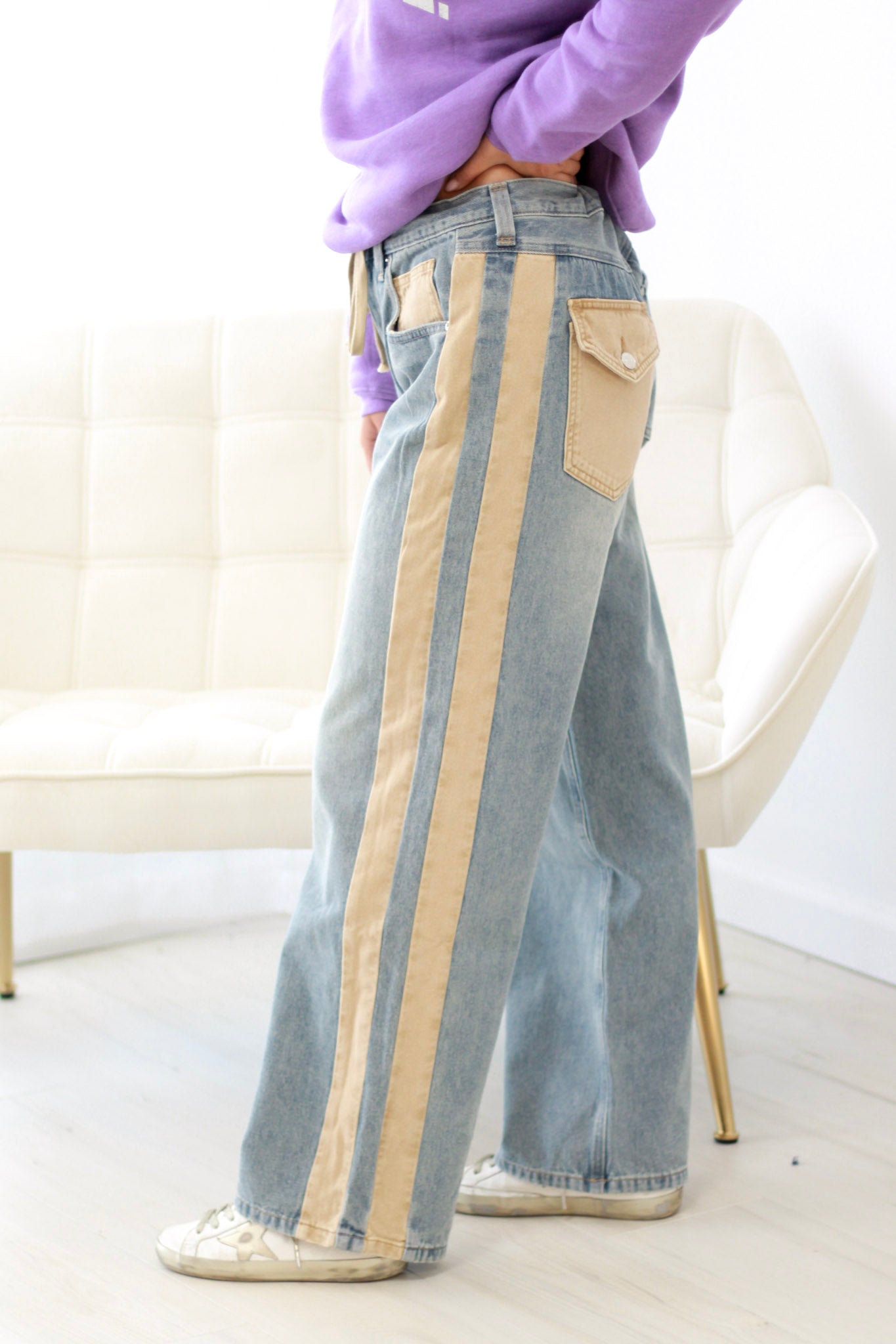 These straight leg jeans feature dual contrast side stripes, a drawstring waistband with grommet detailing, asymmetrical back pockets including one with a flap and button closure, and raw edge seams for a cool, deconstructed look.