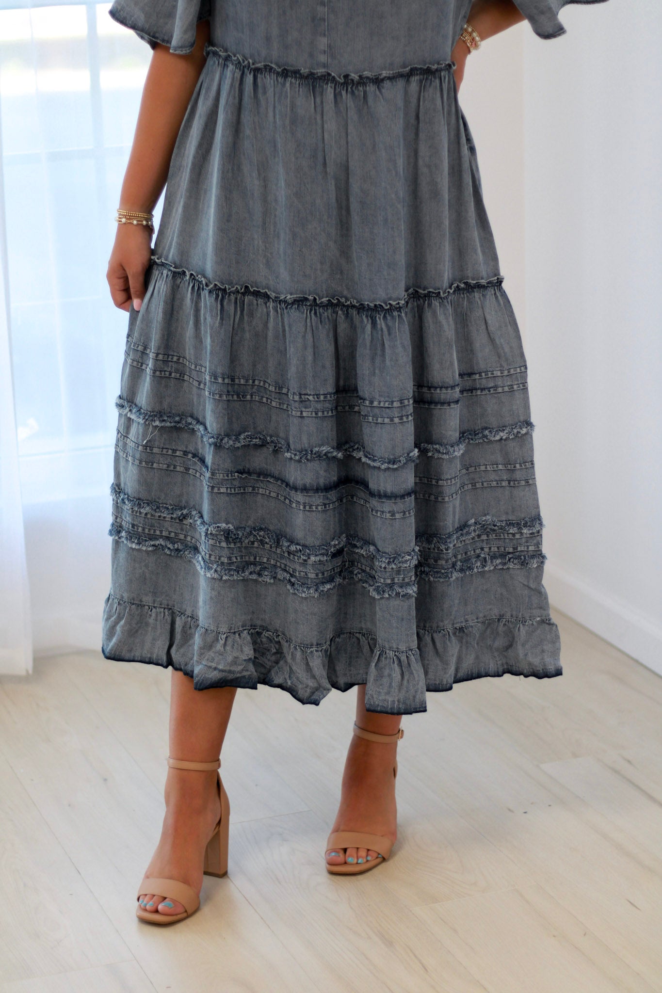 This charming chambray denim dress features a delicate ruffle skirt and a flattering V-neck. Its generous true-to-size fit ensures comfortable wear all day. Perfect for a casual yet stylish look.