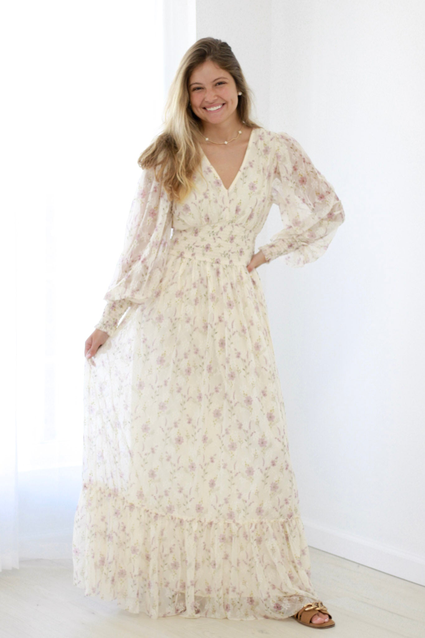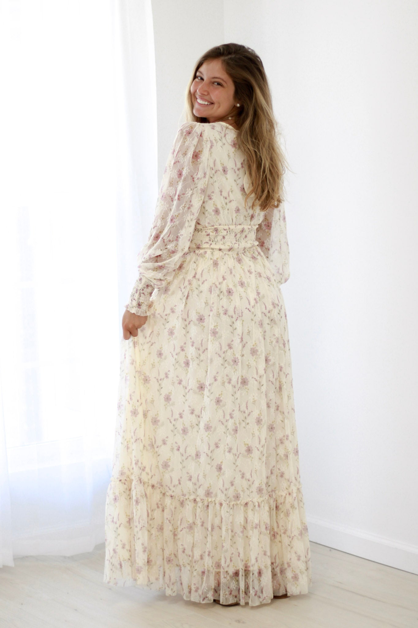 This maxi features a delicate mesh overlay and a wrap style bodice for comfortable fit. Sheer sleeves and a flattering V-neck add an elegant touch. Perfect for an elevated event, it combines style and sophistication effortlessly.