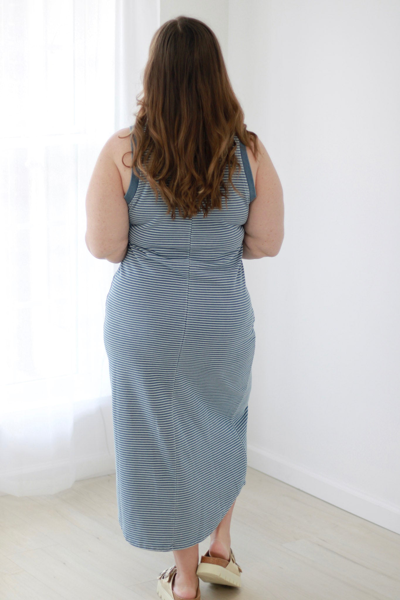 Whether you're heading to brunch, running errands, or enjoying a weekend getaway, this striped dress delivers that perfect blend of comfort and polished style. The classic navy stripes add a nautical-inspired touch that pairs beautifully with any accessories.