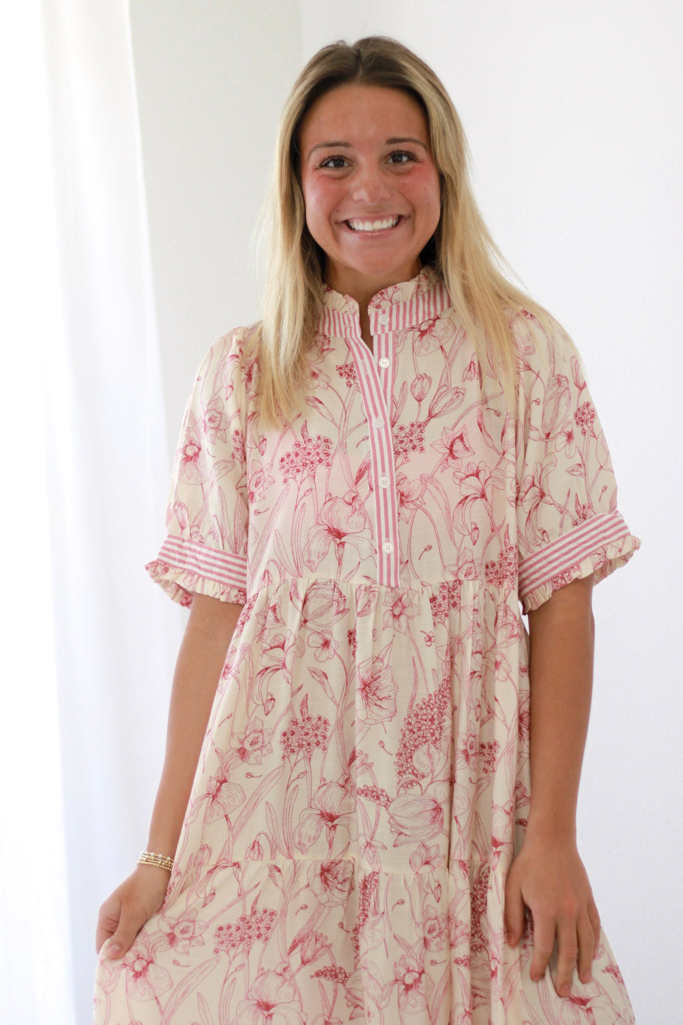 Step into spring with this charming floral midi dress that combines comfort and sophistication. The delicate print and relaxed silhouette make it your new go-to for garden parties, brunches, and special occasions.
