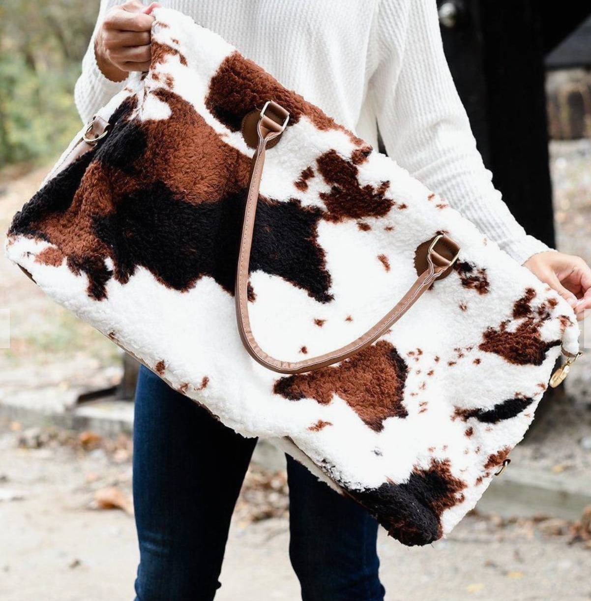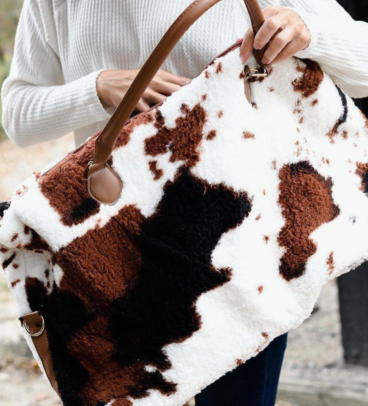 Cow print Sherpa Weekender for the WIN!
