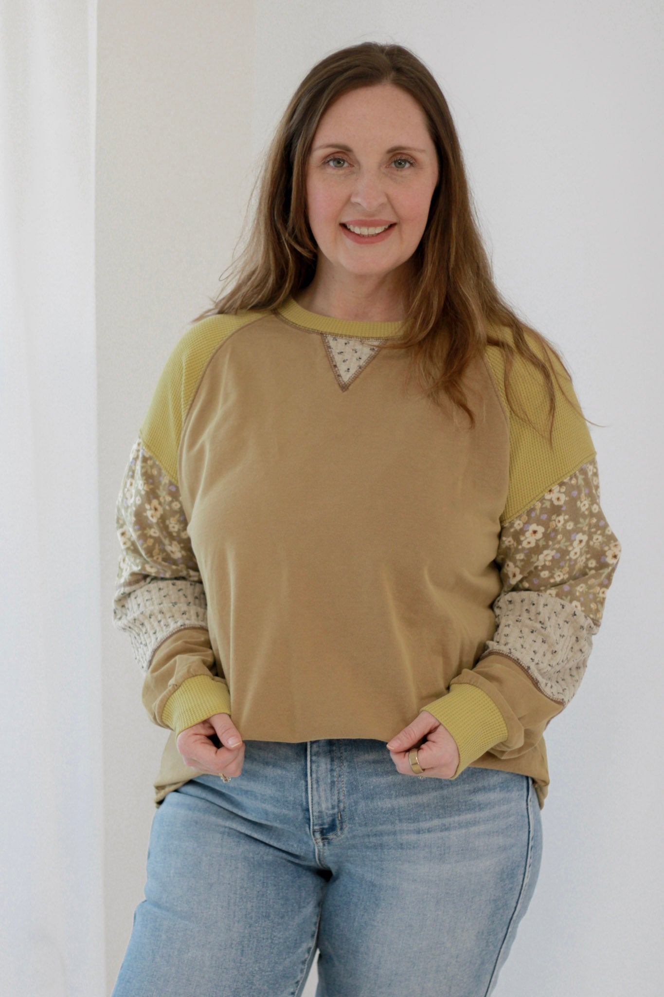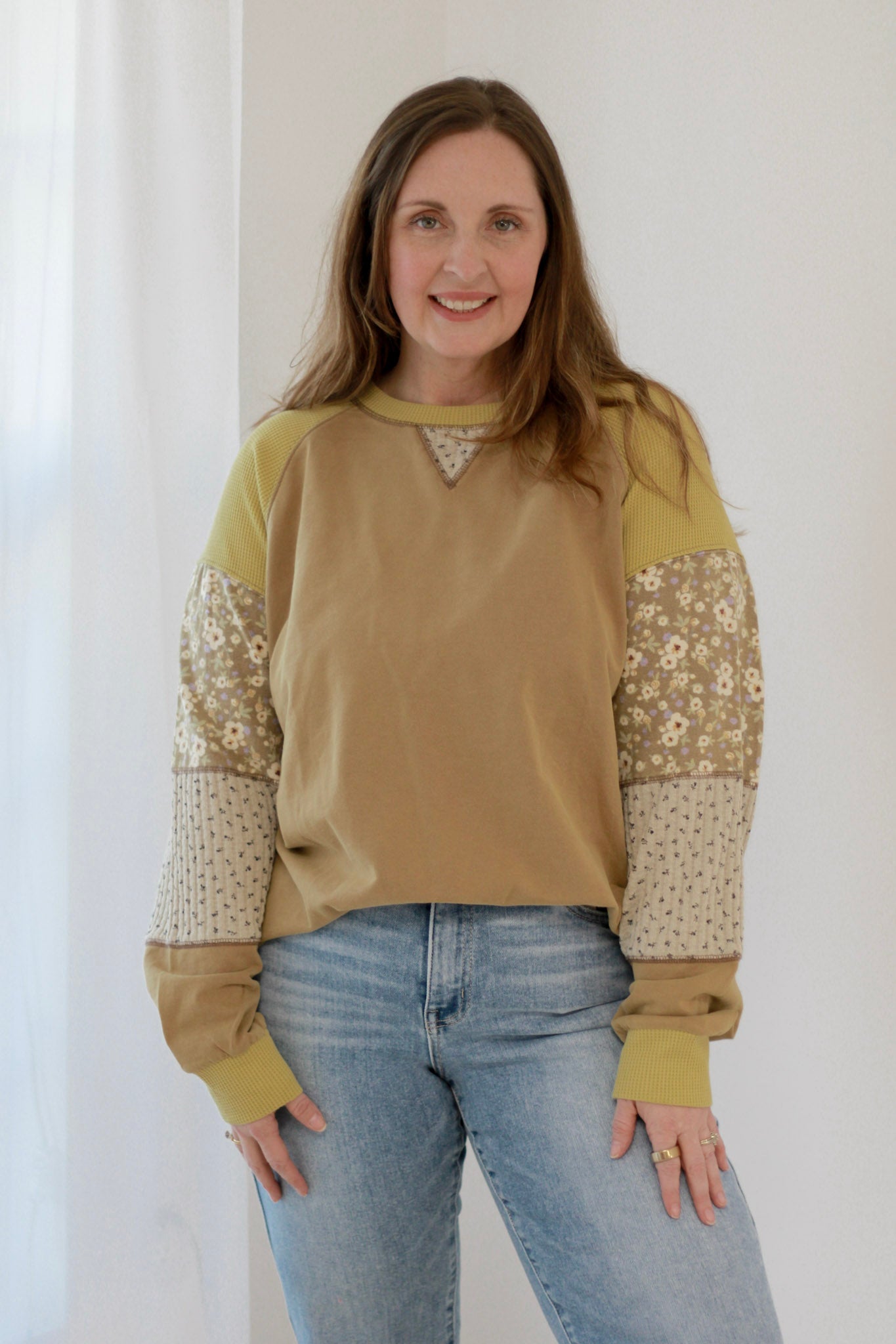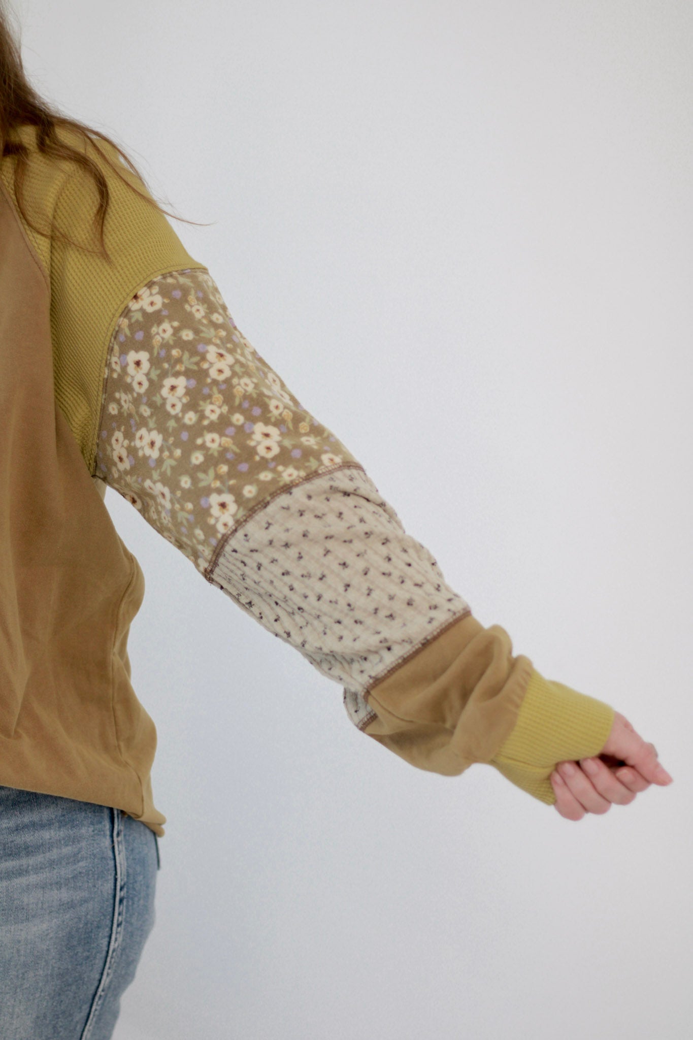 - Patchwork floral and plaid contrast fabric