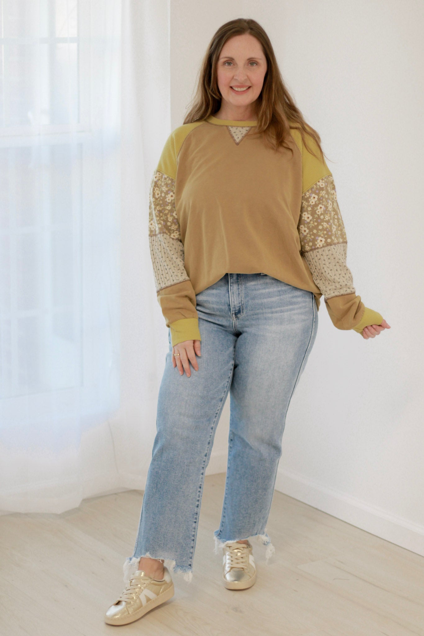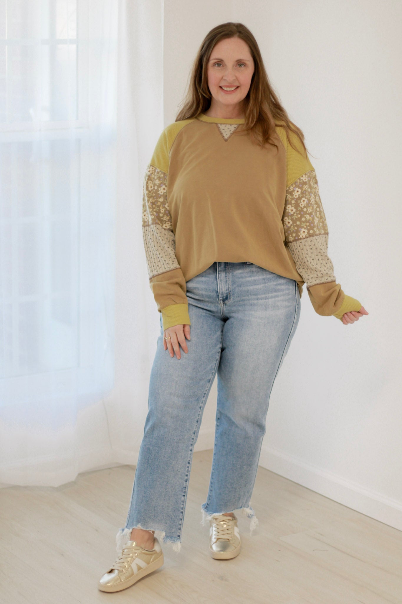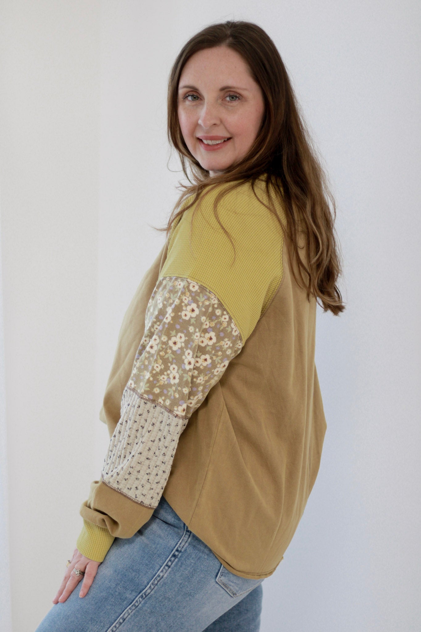 - Patchwork floral and plaid contrast fabric