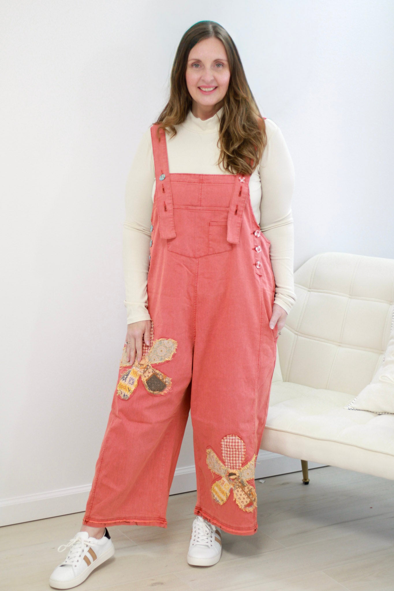 This jumpsuit features adjustable button straps and side button closures for a customizable fit. Its wide leg and oversized silhouette create a relaxed, comfortable feel, while the mixed print flower patchwork detailing adds a unique, stylish touch. Practical back pockets complete the design, combining fashion with functionality.