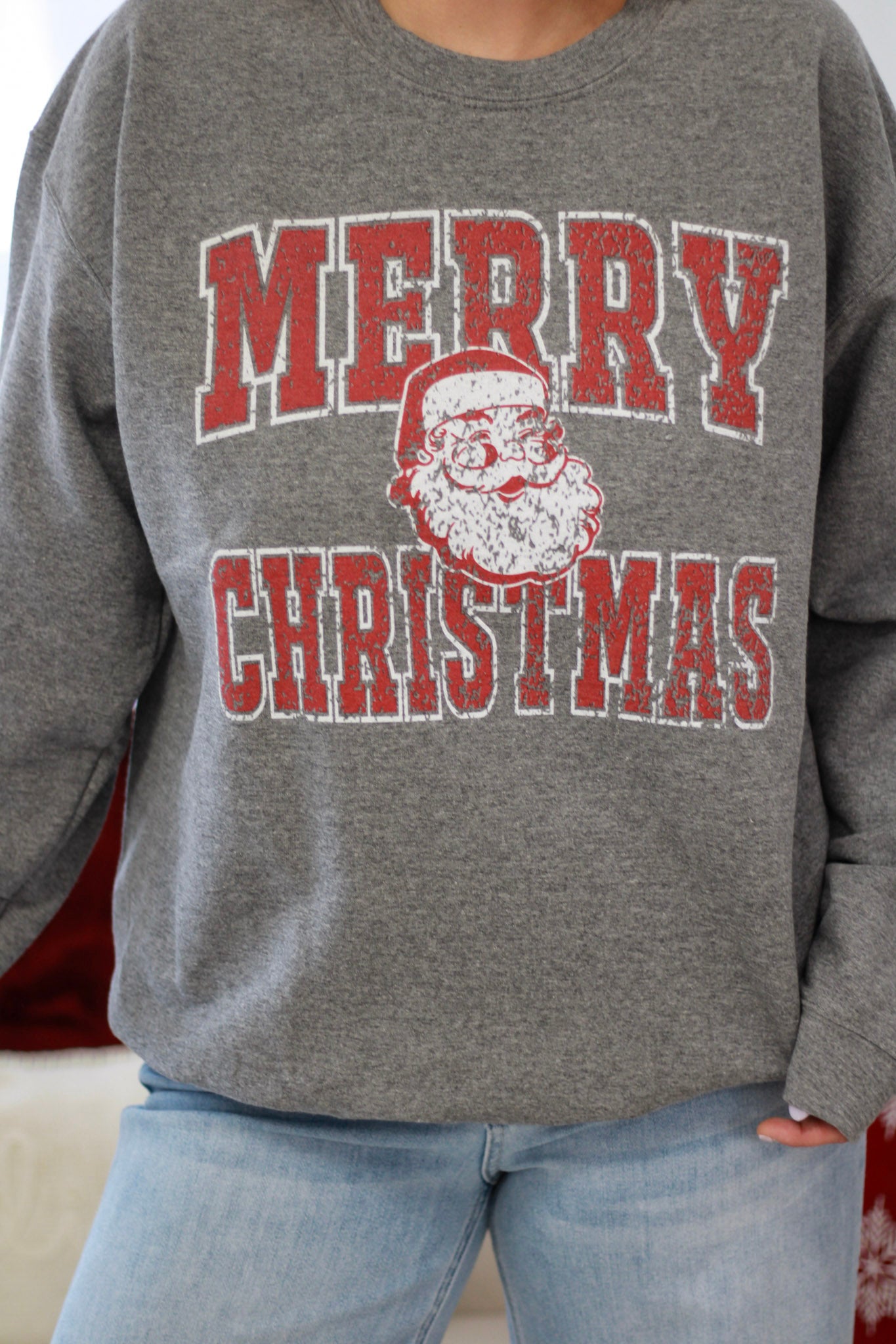 Cozy fleece sweatshirt featuring a retro distressed Santa and "Merry Christmas" graphic that brings nostalgic holiday charm to your seasonal wardrobe. True-to-size fit ensures comfortable wear straight out of the box. Perfect for casual holiday gatherings, festive lounging, or gift-giving.