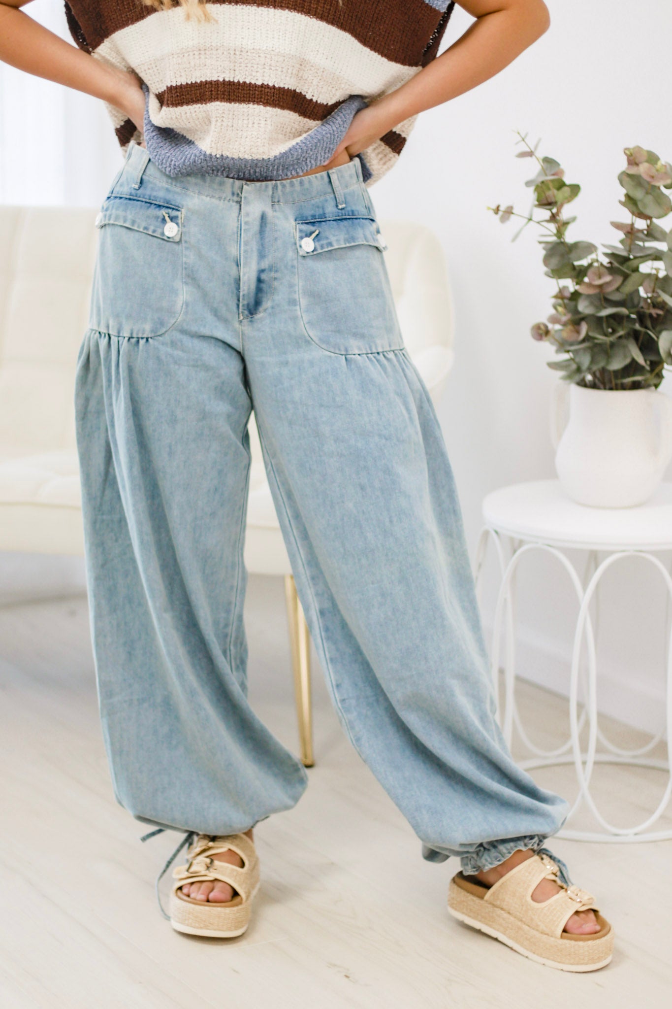 Solid denim wide leg pants featuring a drawstring cinch tie cuff for a bubble pant effect, a back elastic waistband, two front pockets, belt loops, and added pleats for detail.