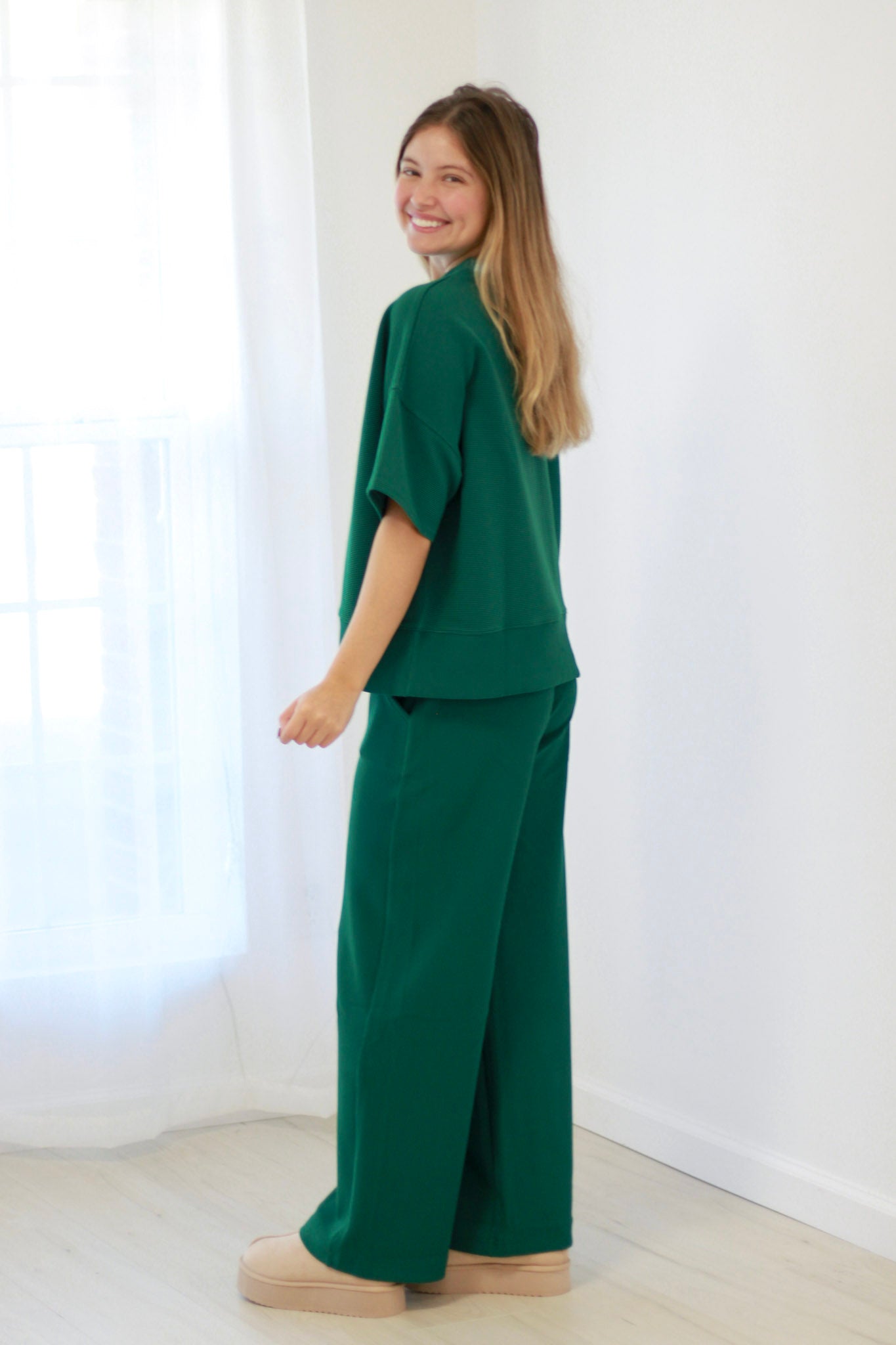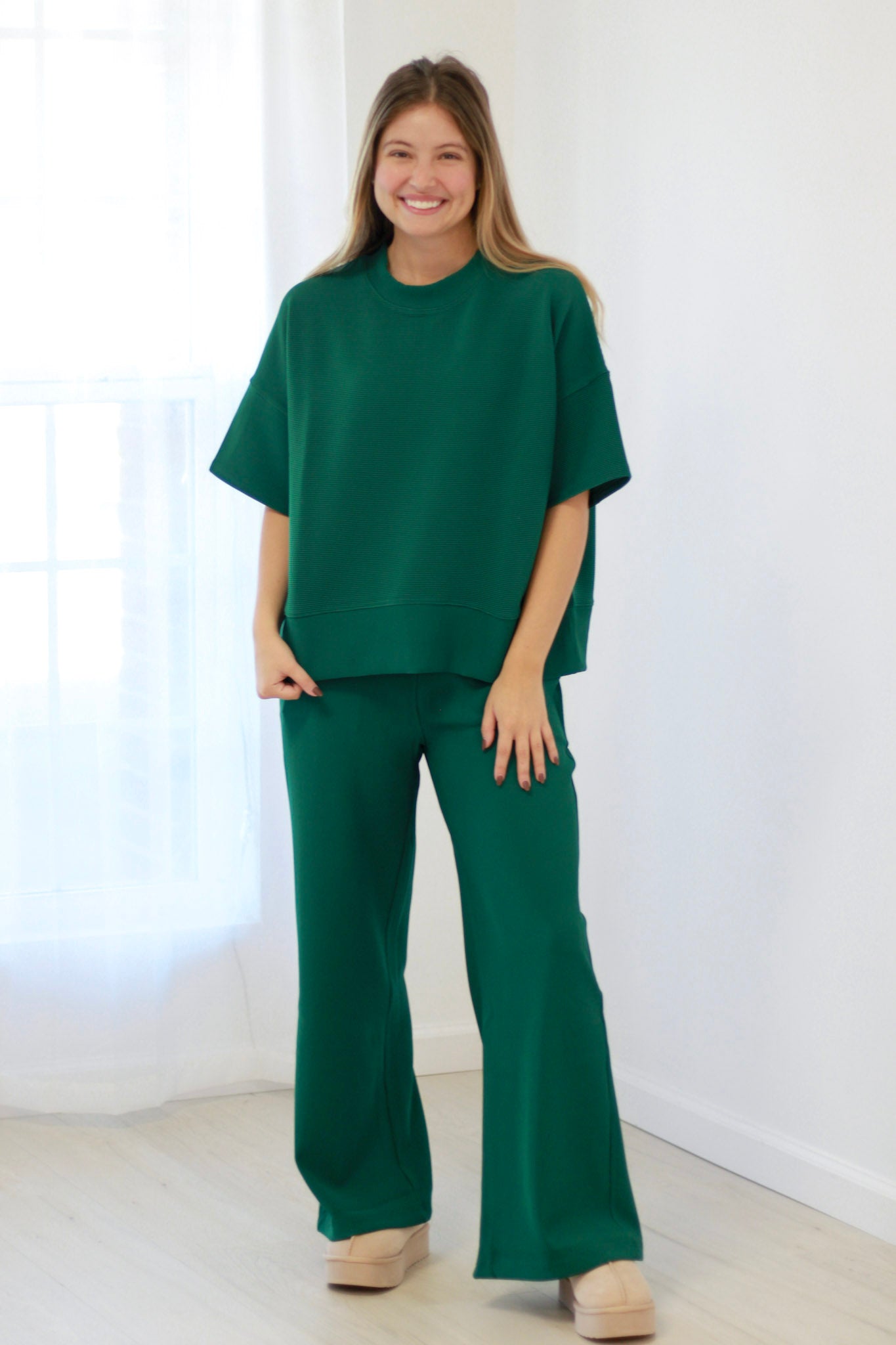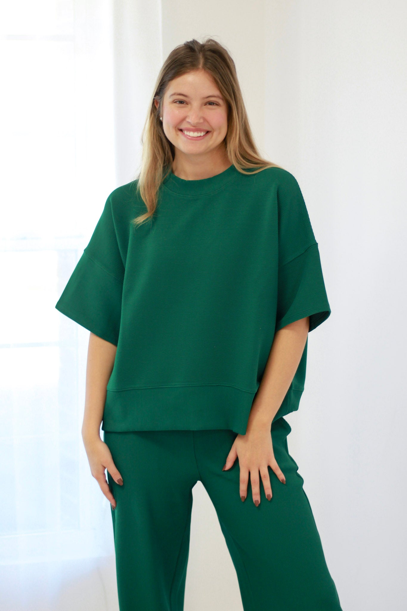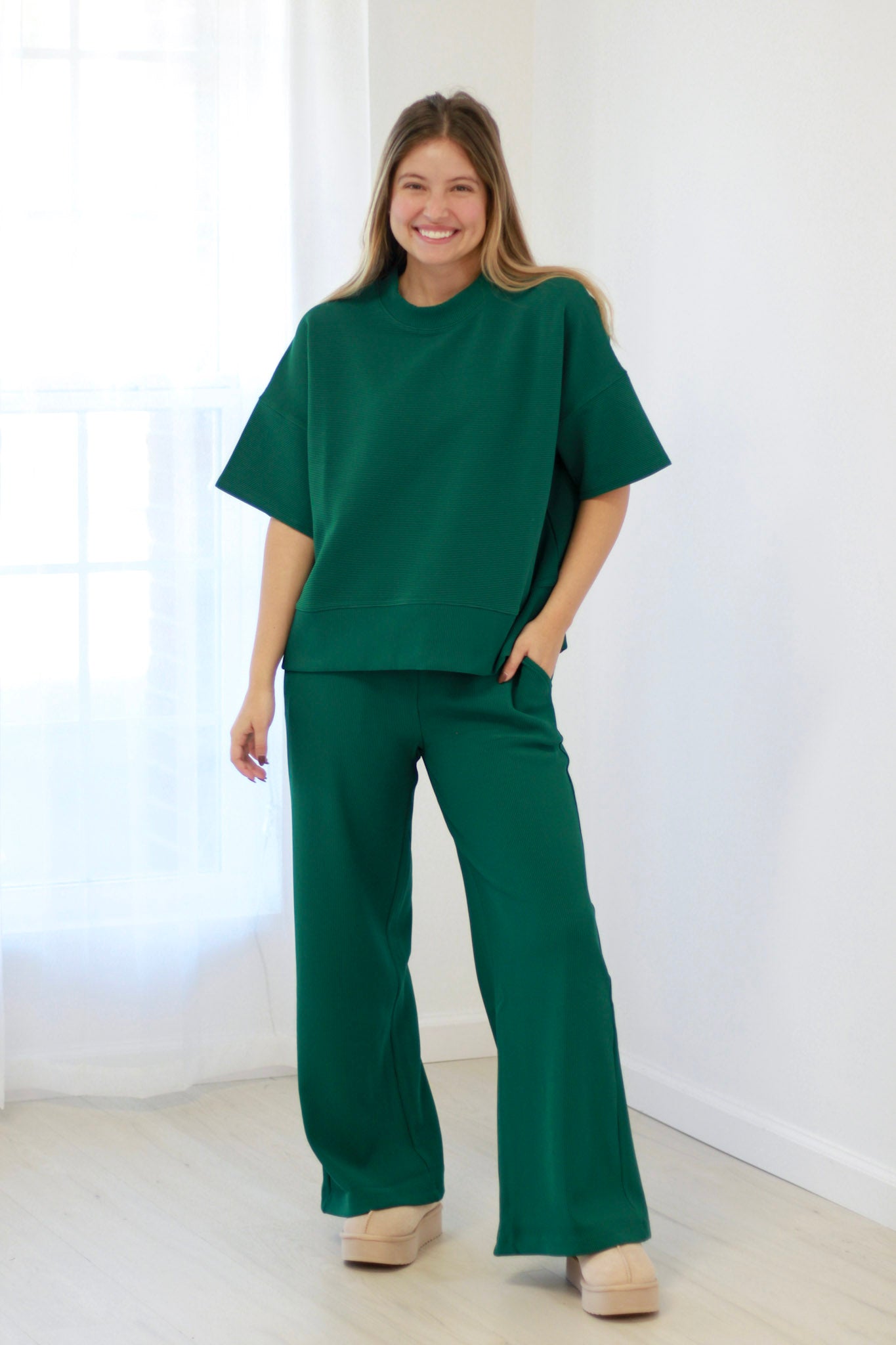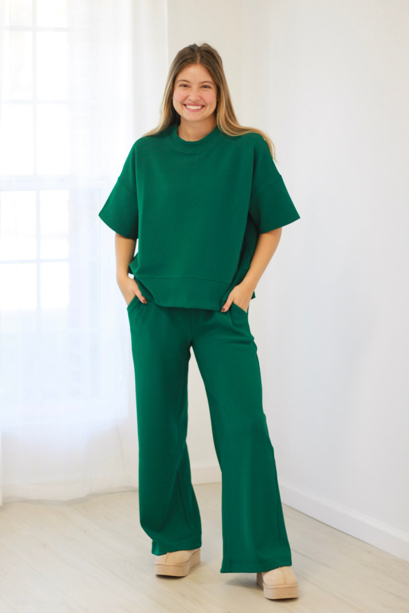 This set features a comfortable ribbed knit fabric that ensures durability and softness against the skin. The round neck tee pairs perfectly with matching pants for a coordinated look. Its quality construction makes it ideal for both casual wear and relaxed lounge days.