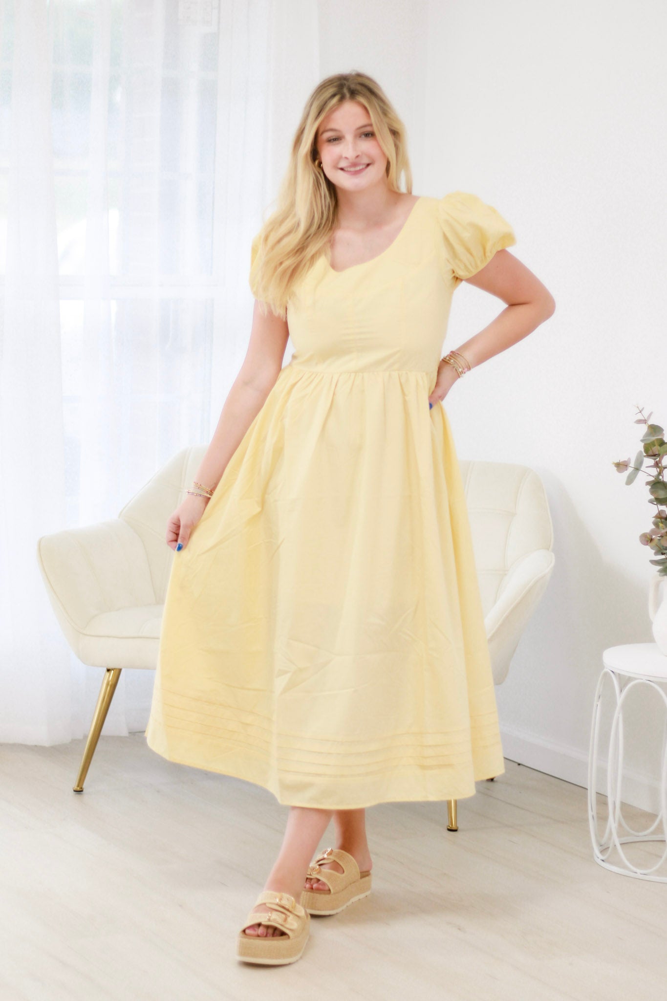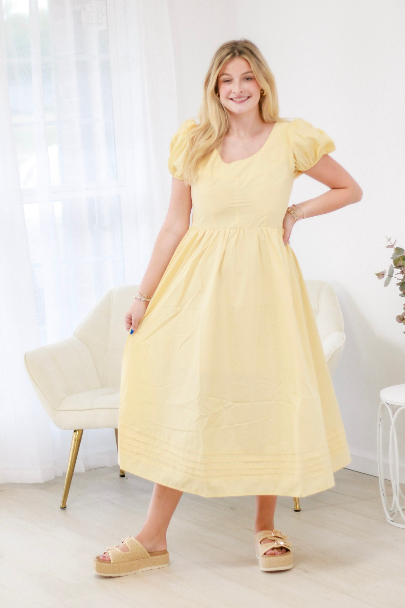 Brunch Date Balloon Sleeve Midi Dress in Light Yellow