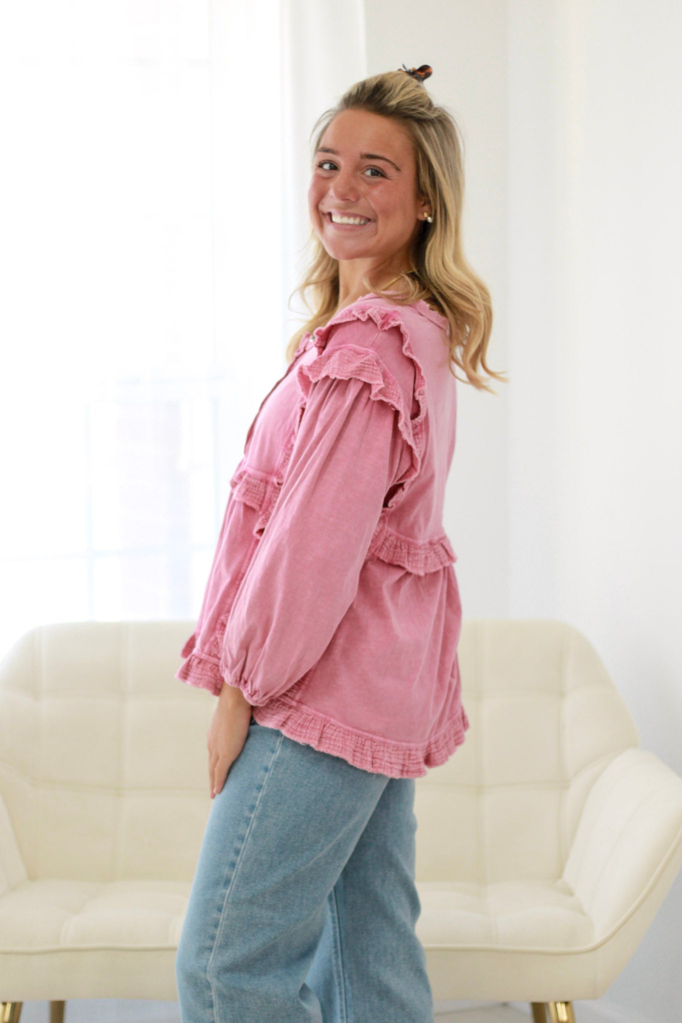 This charming long sleeve top features delicate ruffle sleeves that add a playful, feminine touch to your everyday wardrobe. The soft pink hue pairs effortlessly with denim or skirts for a sweet, put-together look. True to size and designed for all-day comfort, it's the perfect piece for anyone who loves a girly aesthetic.