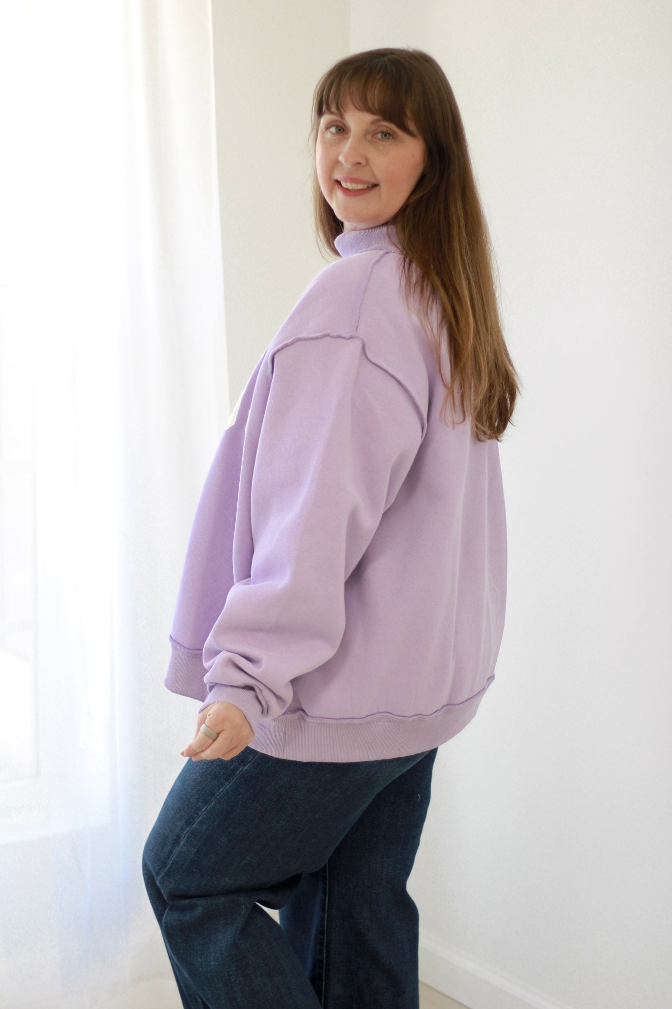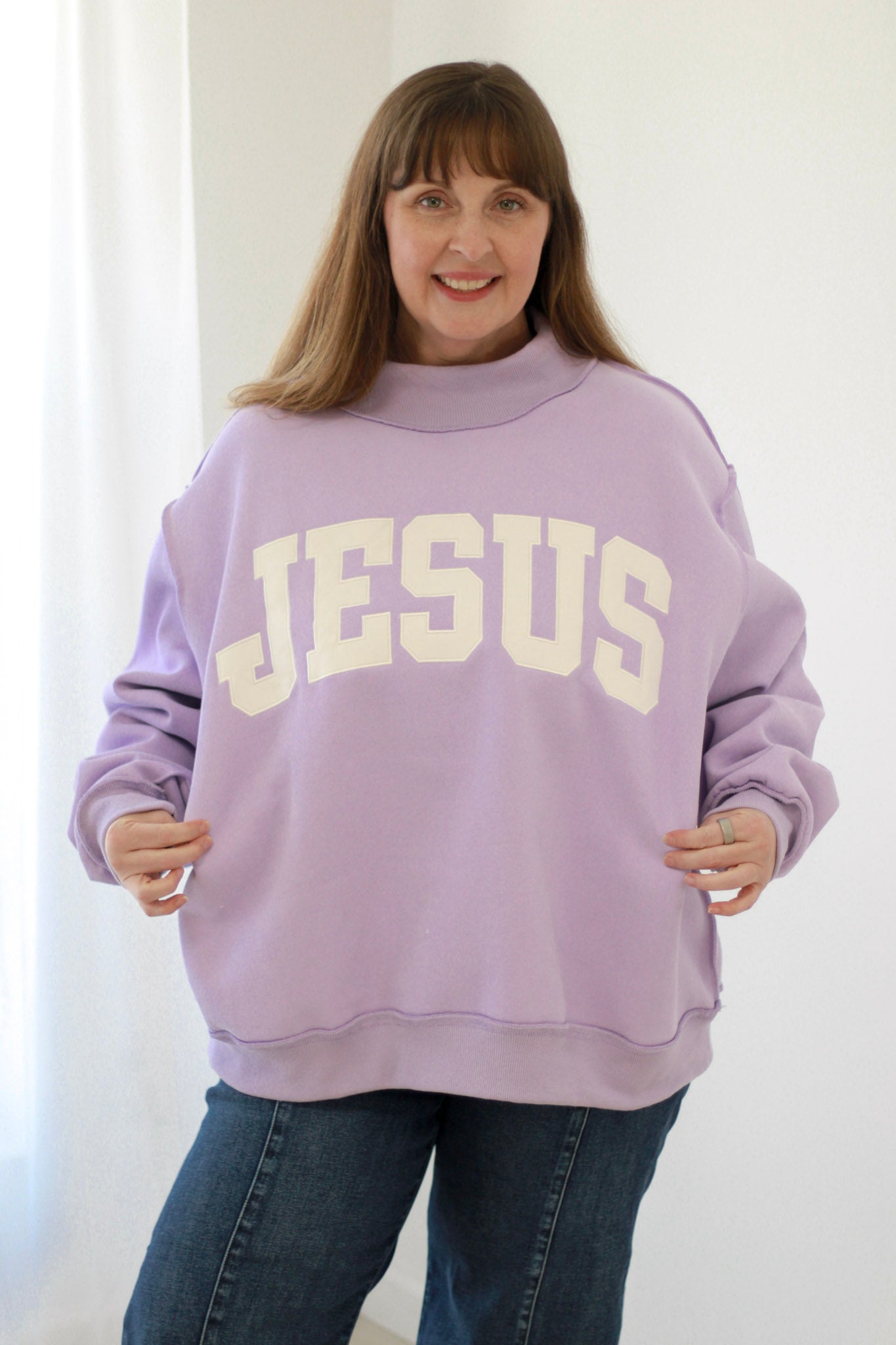 Make a statement with this reversible mockneck pullover that lets you choose your message—Jesus on one side, God is Good on the other. Crafted in a soft lavender hue with an oversized, relaxed fit, this pullover is equal parts cozy and cool, perfect for layering or wearing solo.