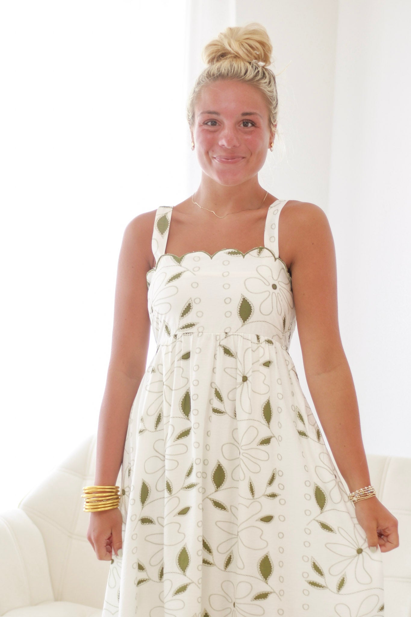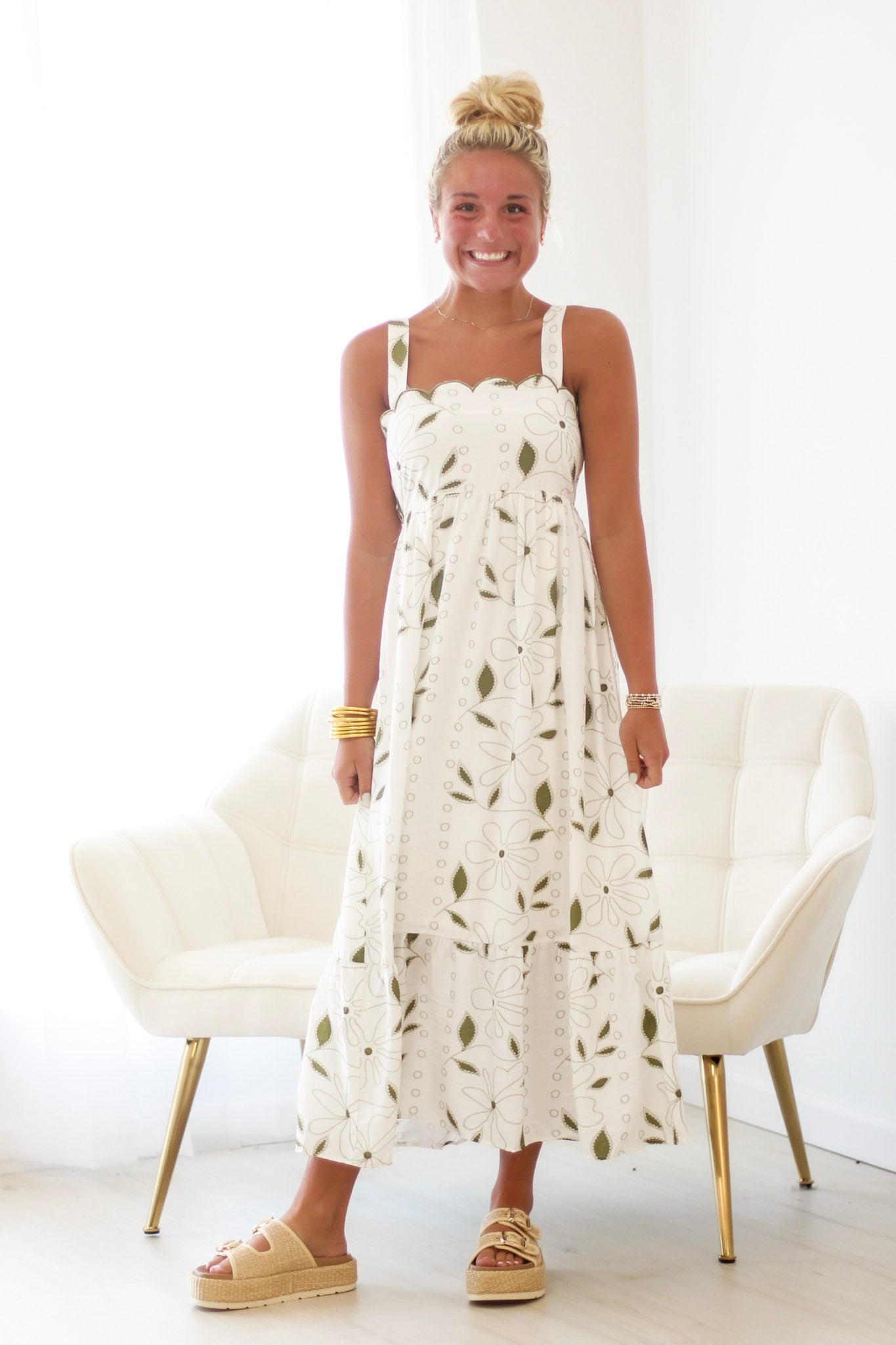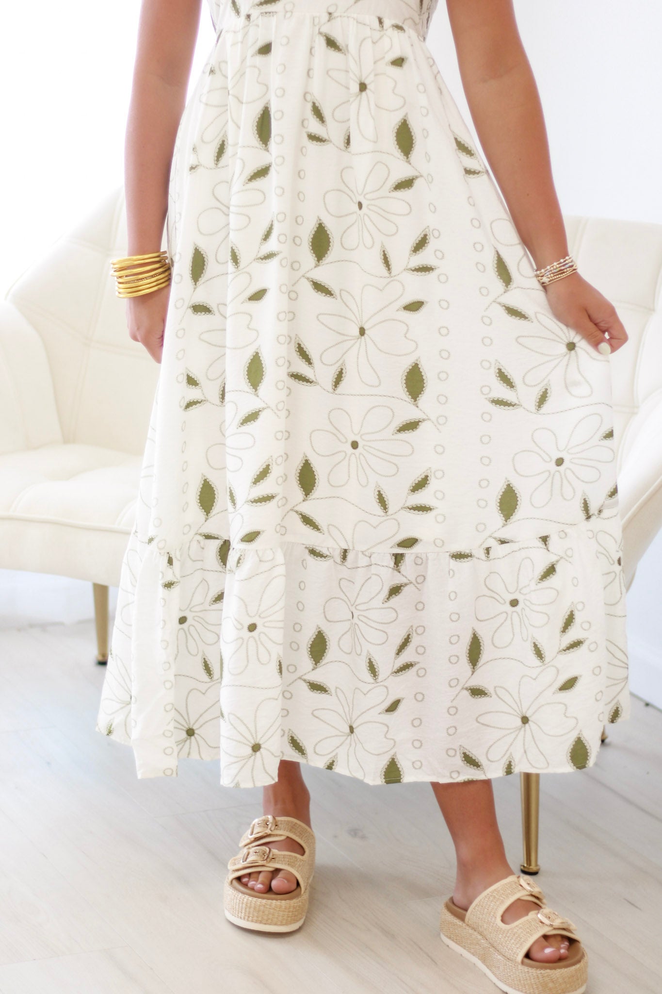 - Olive floral dress with soft white base