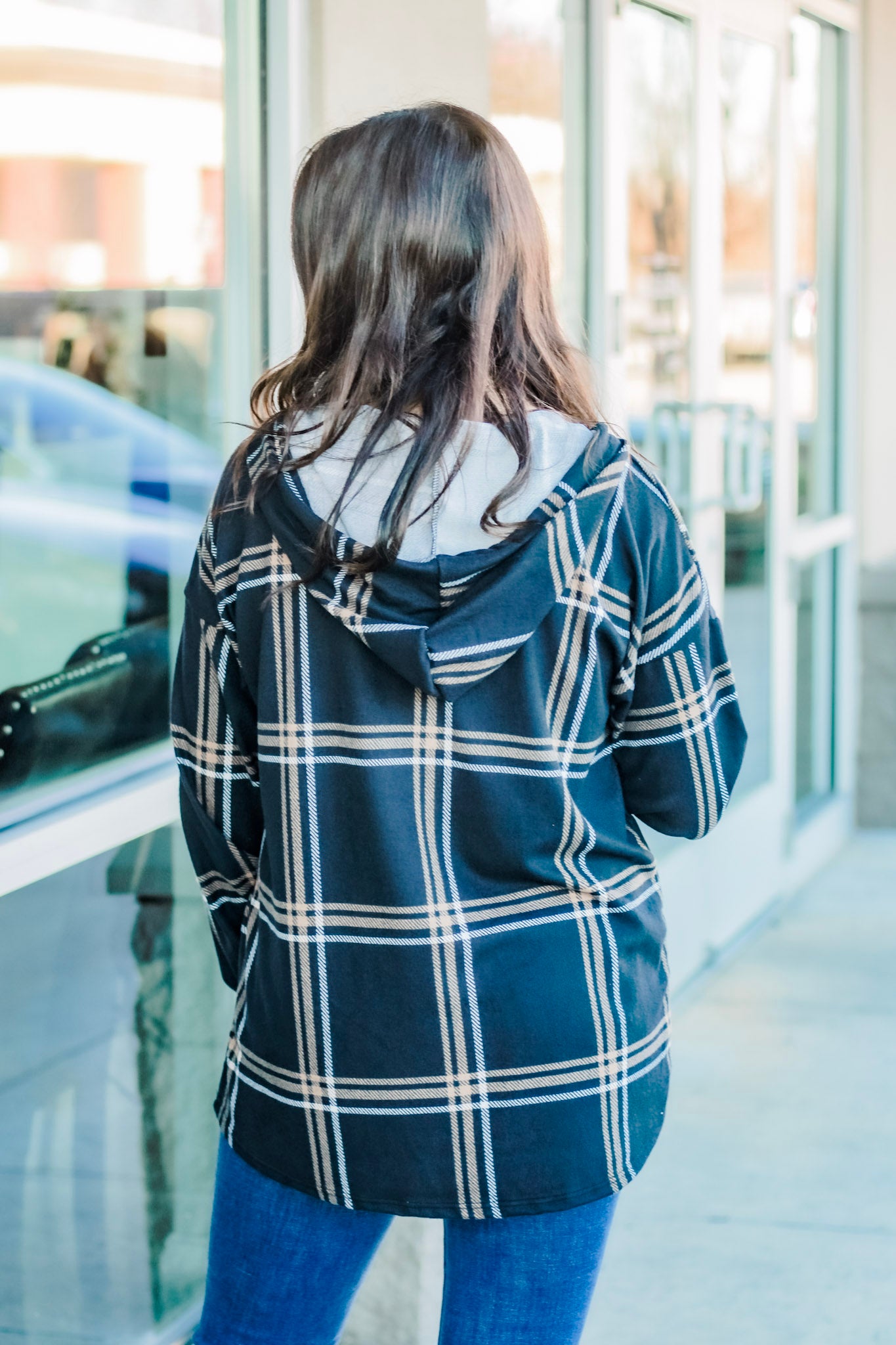 - Black hoodie with plaid detail