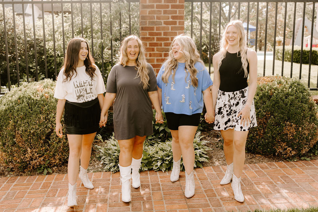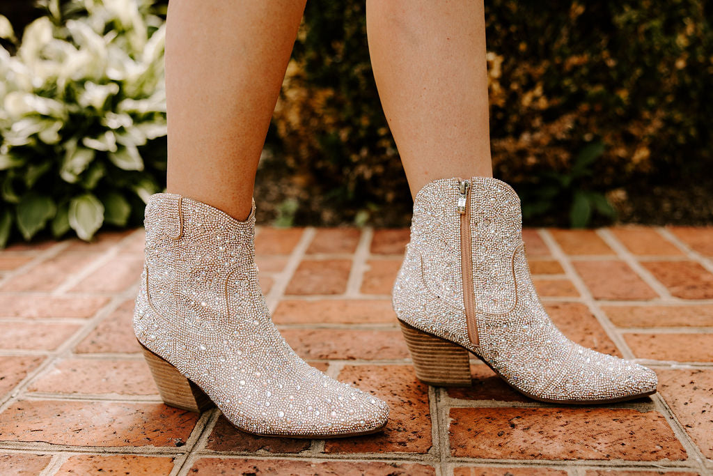 We have the perfect rhinestone booties for your night out! Pair these with cute dresses, shorts, skorts, jeans, etc. The natural silver color is a perfect match to so many options!