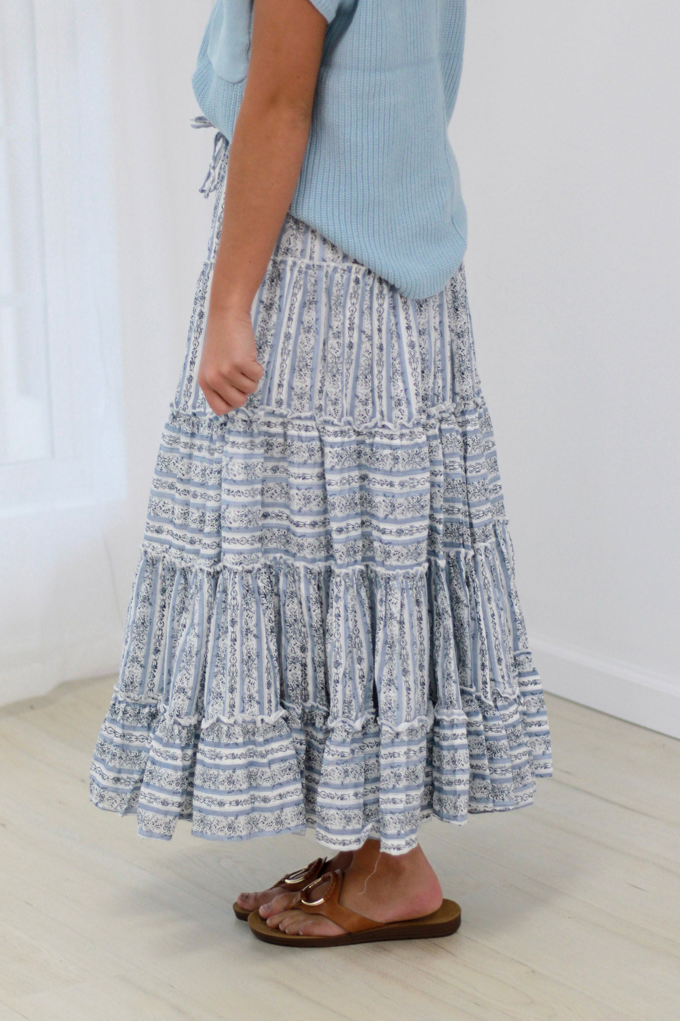 Effortlessly elegant and endlessly versatile, this tiered maxi skirt is your new warm-weather essential. Featuring a beautiful floral print in soft denim tones, the flowing tiers create gorgeous movement with every step.
