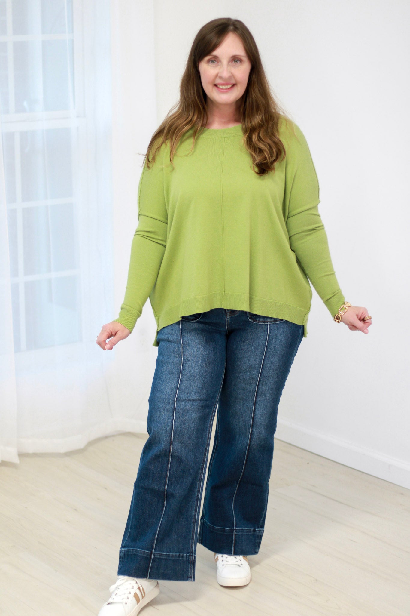 Solid long sleeve sweater top featuring a round neckline, exposed seams for added detail, ribbed cuffs, a ribbed bottom band and is a high-low design.