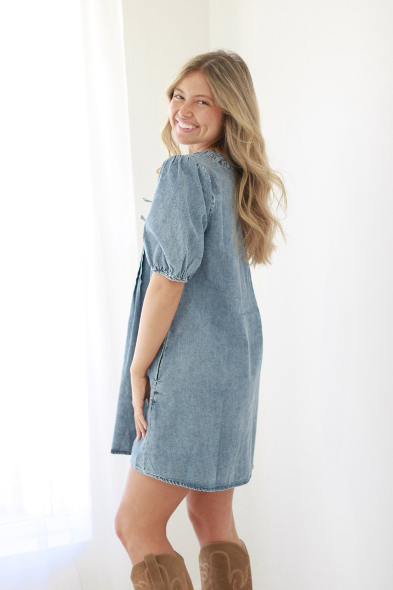 This relaxed-fit mini dress features a flattering V neckline and charming short puff sleeves that add playful dimension. The front tie detail and pleated accents create visual interest, while the flounce skirt offers effortless movement—perfect for casual days or weekend outings. Crafted in washed denim with natural color variations, this slip-on style delivers laid-back sophistication without the fuss.