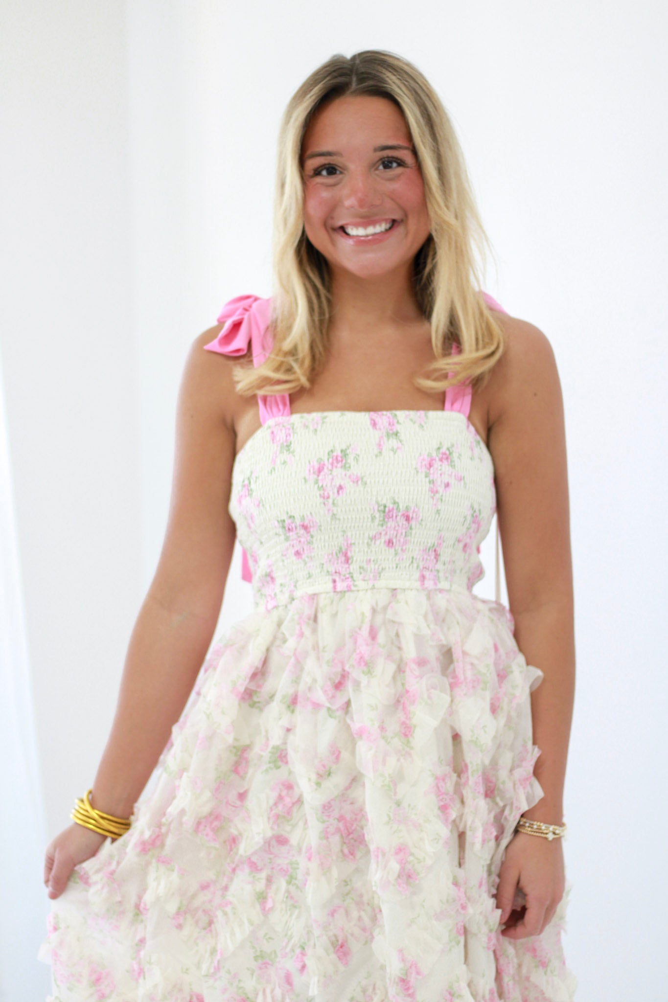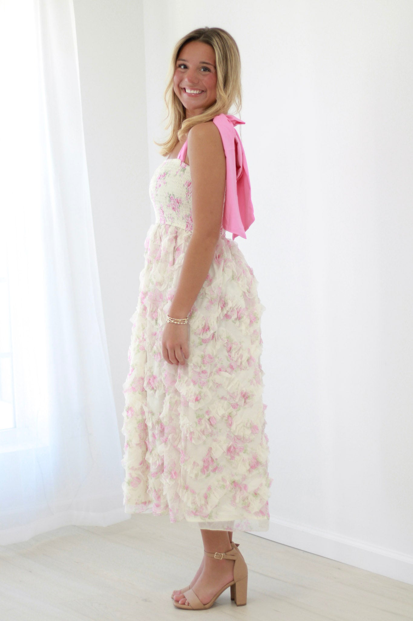 Introducing The Heirloom Spring Dress—a stunning floral masterpiece that feels like it was made just for you. This enchanting dress combines romantic blooms with a flowing silhouette that moves beautifully with every step, creating an effortlessly elegant look that turns heads.
