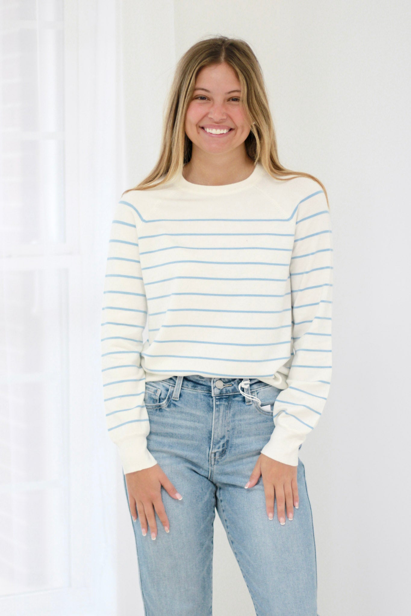 Fall in love all over again with the A Change of Heart Striped Lightweight Sweater in Sky Blue – the breezy essential that brings fresh energy to your everyday wardrobe.