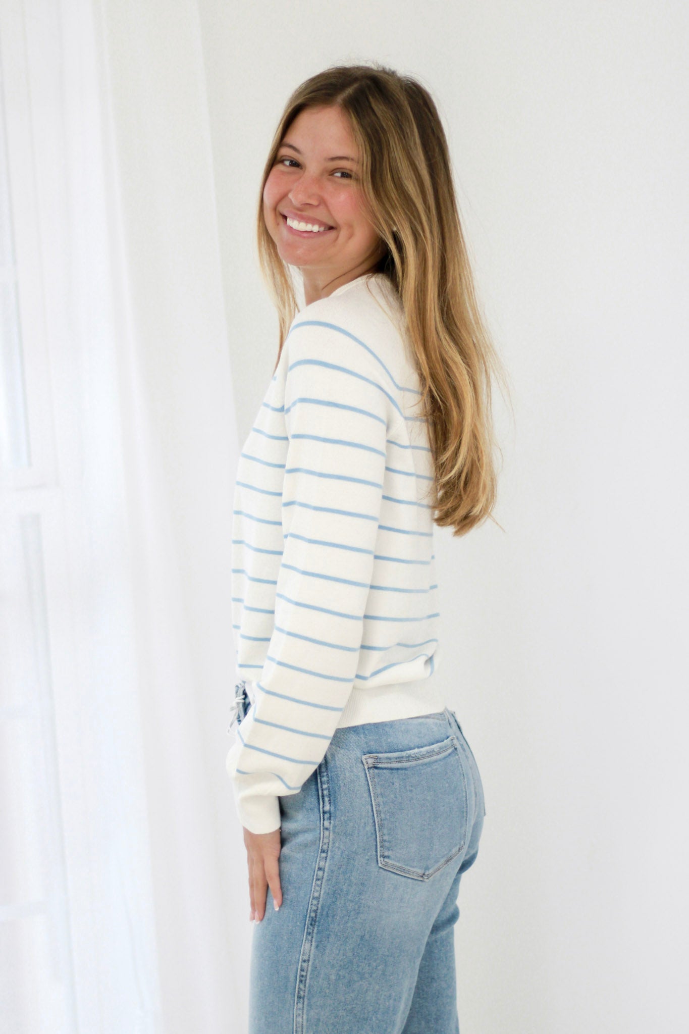 - Beautiful Sky Blue Stripes – Soft, flattering color that brightens your look and pairs beautifully with denim and neutrals