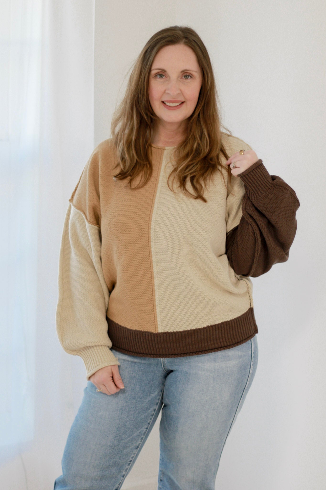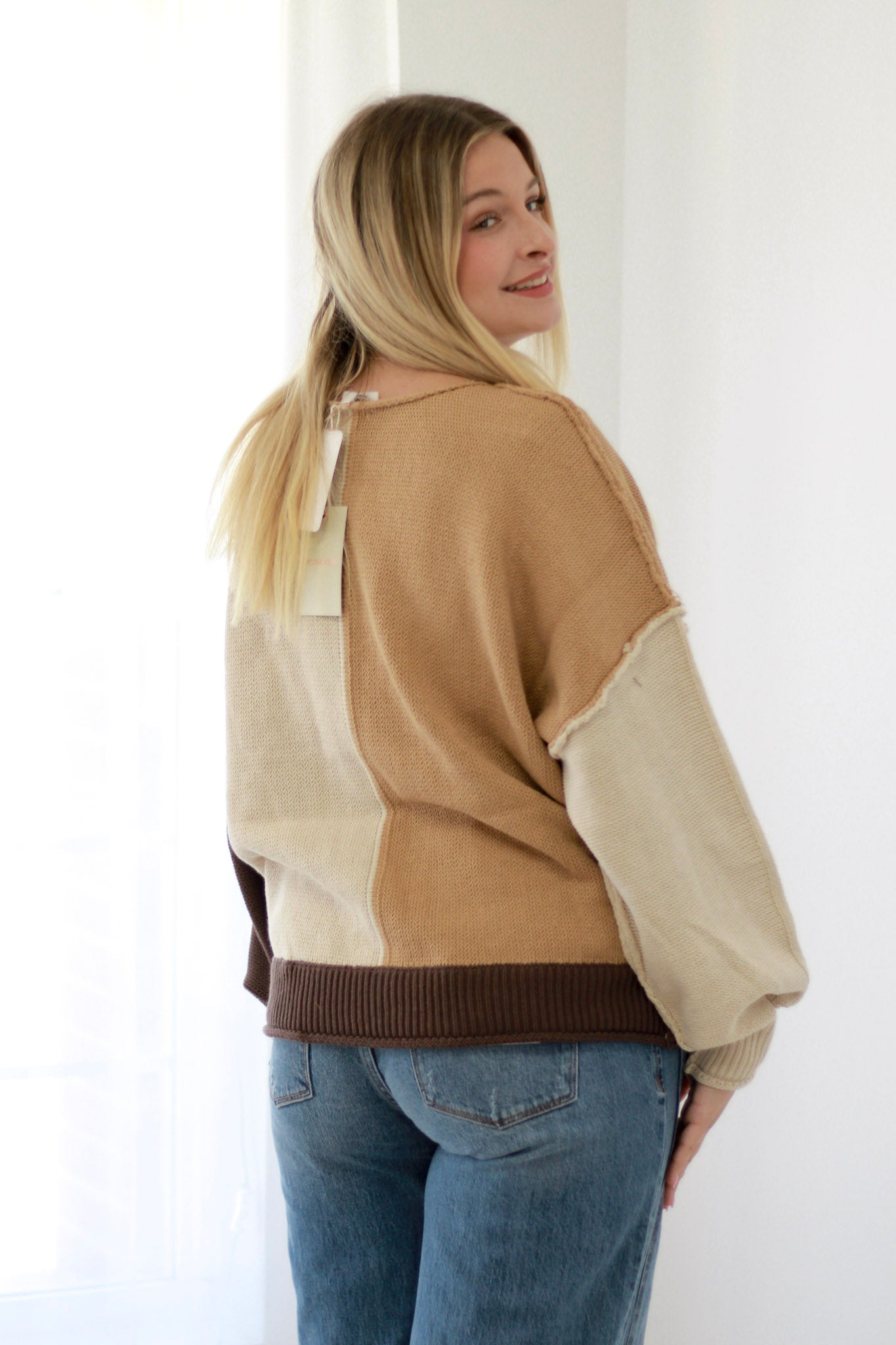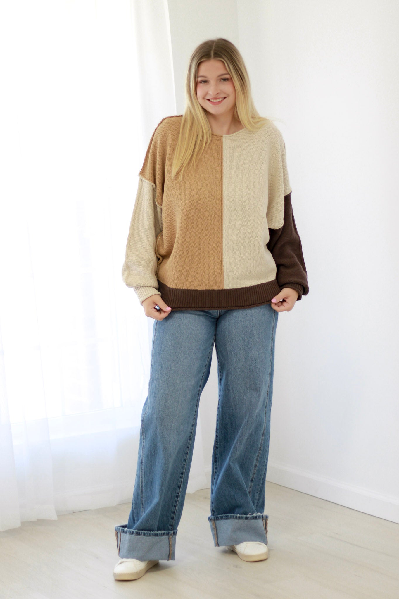 This color blocked sweater features a round neckline and oversized panels of tan, cream, and chocolate brown, designed with dropped shoulders, exposed seam detailing, rolled hems, and ribbed cuffs for a casual, deconstructed look.
