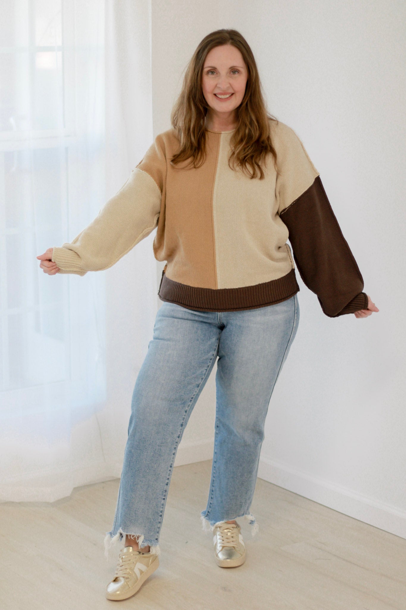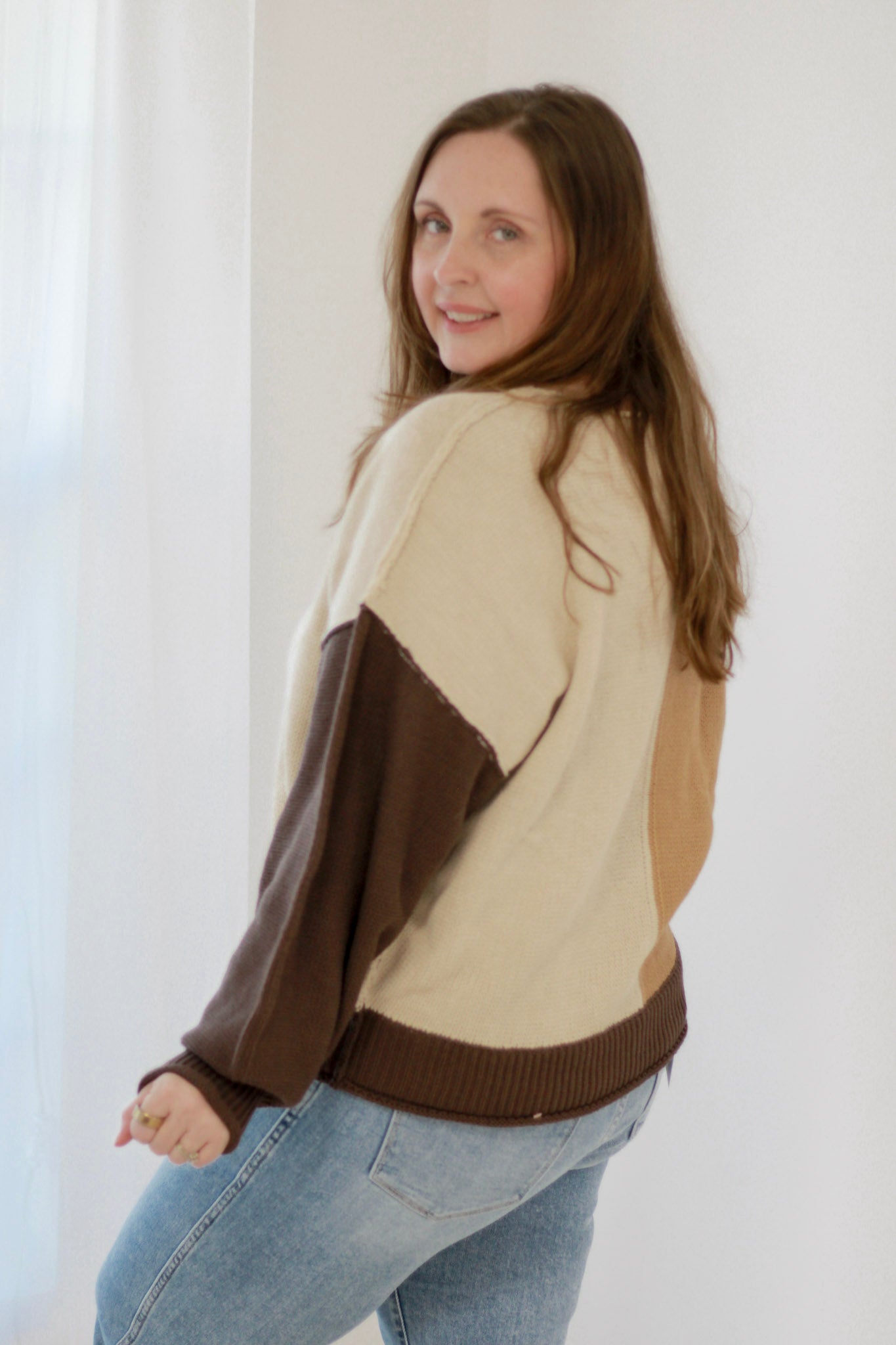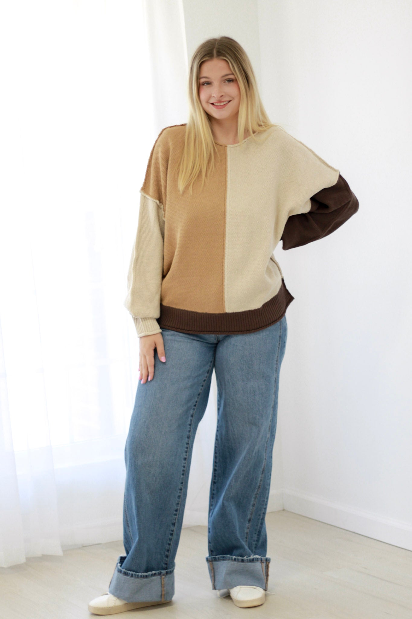This color blocked sweater features a round neckline and oversized panels of tan, cream, and chocolate brown, designed with dropped shoulders, exposed seam detailing, rolled hems, and ribbed cuffs for a casual, deconstructed look.