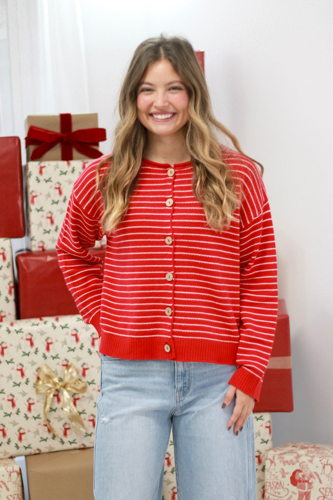 This cozy button-up sweater features classic red and white stripes for a timeless look that pairs effortlessly with any outfit. The soft fabric feels gentle against your skin, making it perfect for layering or wearing solo during cooler months. True to size for a comfortable, flattering fit.