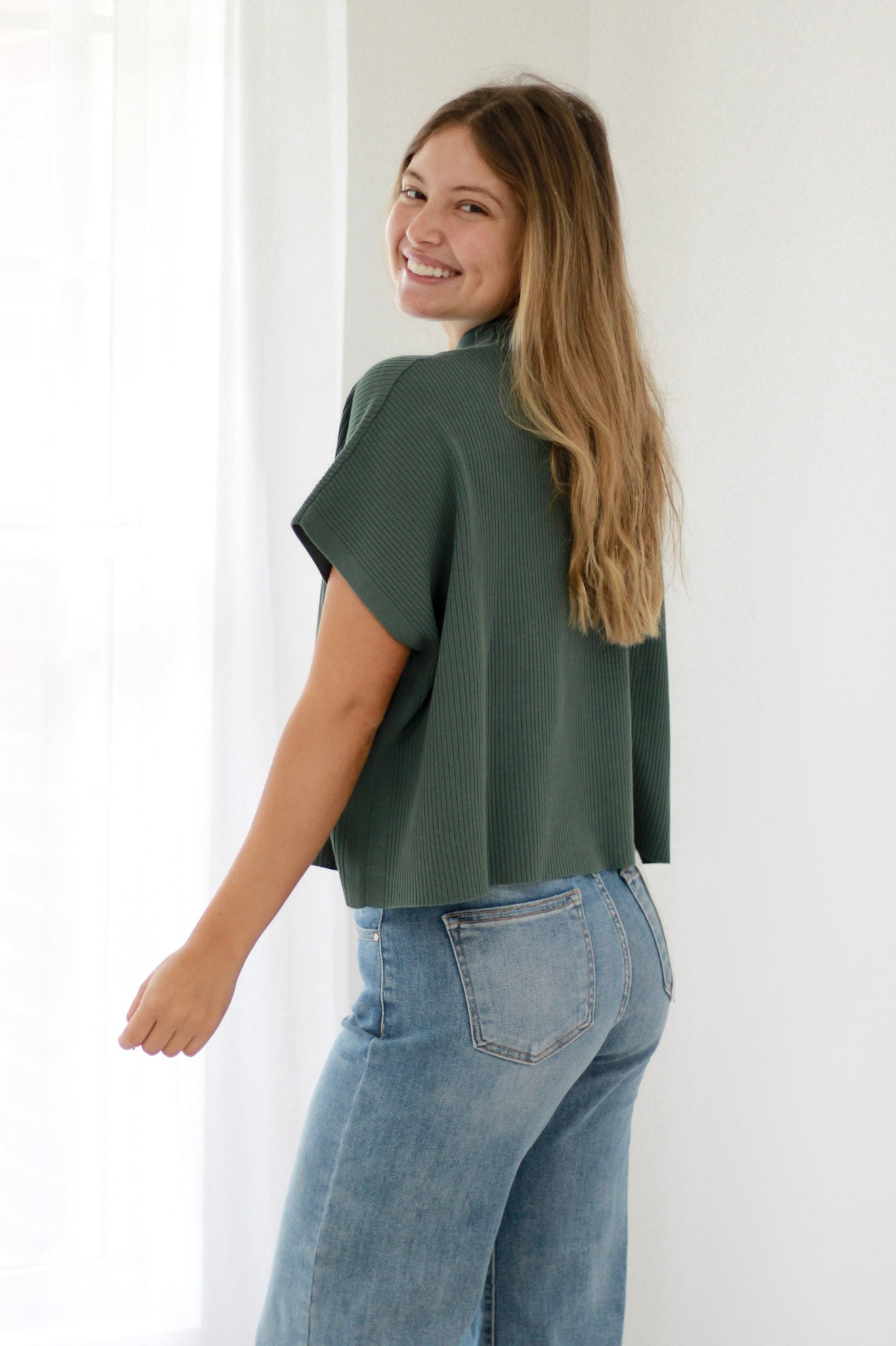This short sleeve sweater features a soft viscose mock neck for comfortable, breathable wear. Its lightweight fabric makes it perfect for layering or wearing on its own during milder days. The ash jade hue adds a fresh, vibrant touch to any outfit.