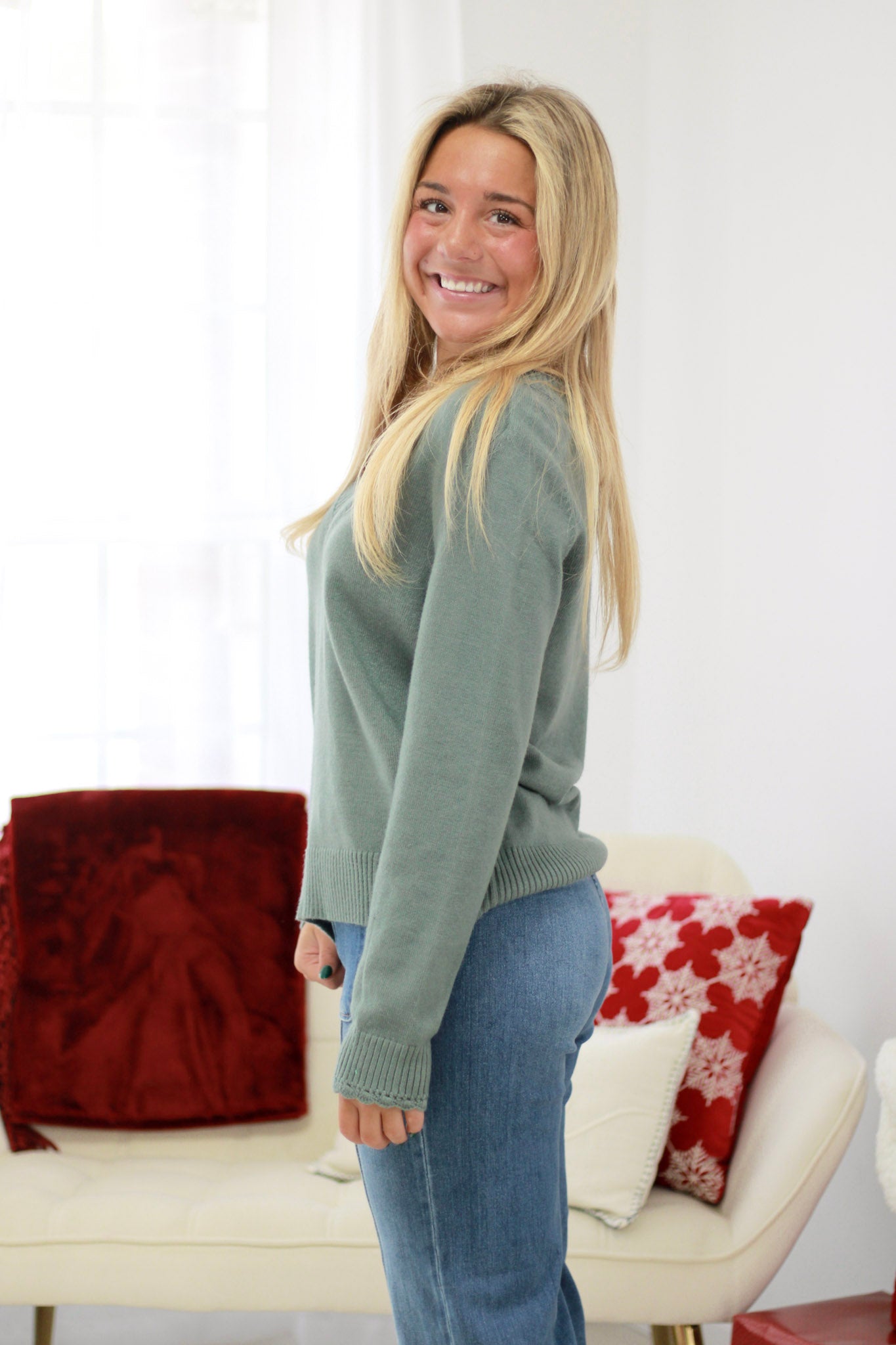 Indulge in luxurious softness with this v-neck sweater that feels as good as it looks. True to size and effortlessly flattering, it's the perfect layering piece for any season. Sweet details and a scallop edge finish make this a wardrobe essential you'll reach for again and again.