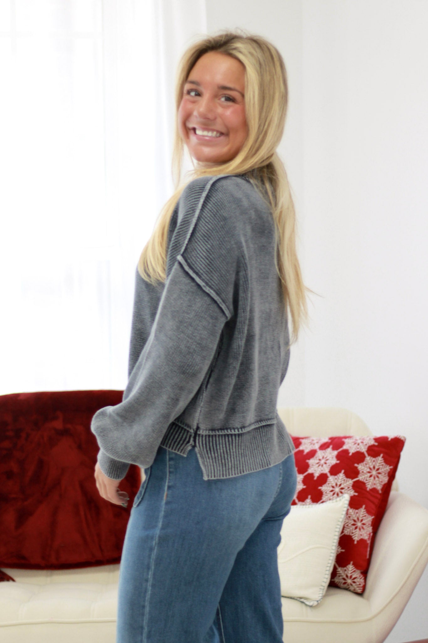 Crafted from soft ribbed fabric that feels luxurious against your skin, this navy sweater delivers comfort without compromise. The true-to-size fit ensures a flattering silhouette that works for any occasion. Layer it effortlessly or wear it solo for an instantly polished look.