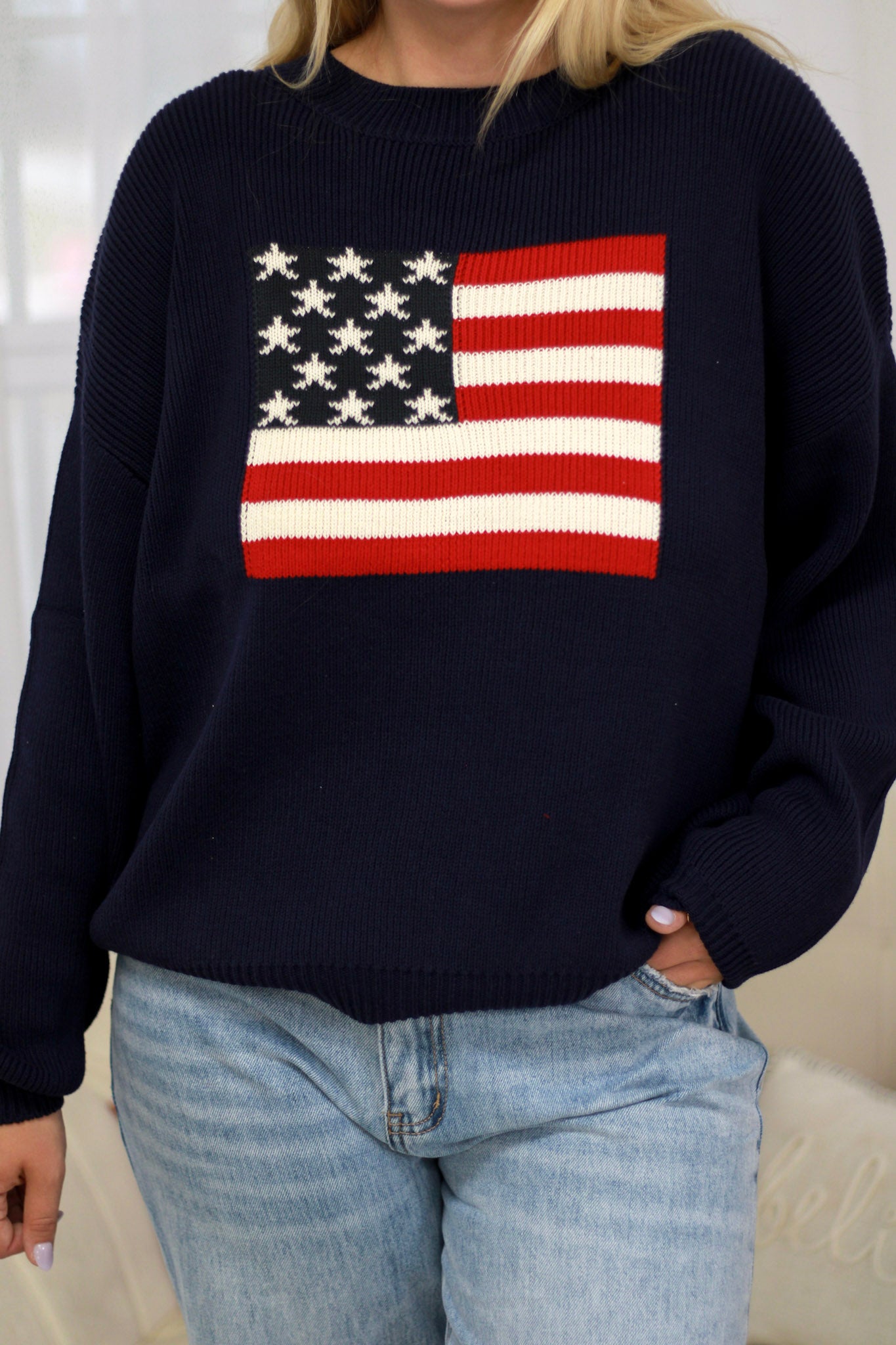 This cozy sweater features a charming flag design that adds patriotic flair to your everyday wardrobe. The relaxed fit runs true to size, making it easy to find your perfect match. Soft and versatile, it's an adorable layering piece for any season.